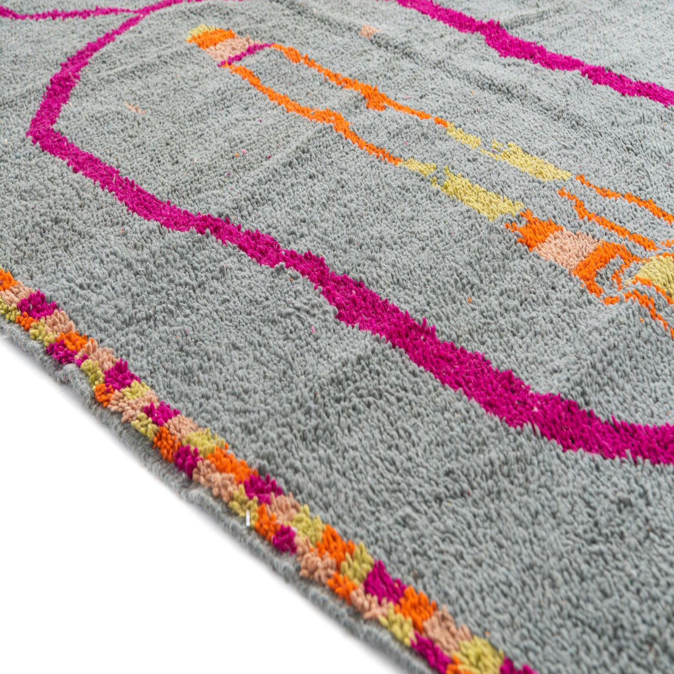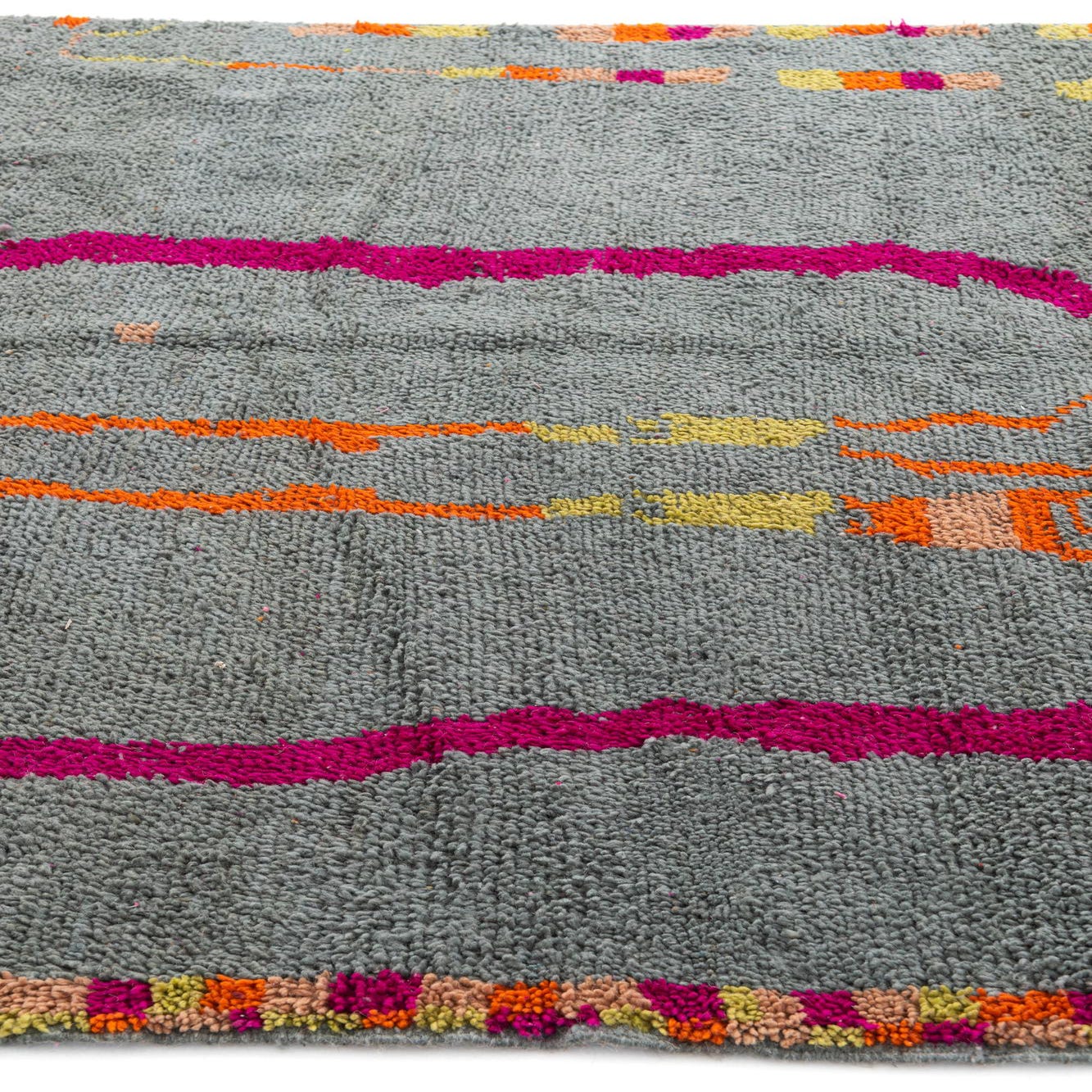 This Moroccan collection 11 Ft Runner rug is hand-knotted from 100% wool, offering an authentic craft appearance with a unique touch. Its gray background lays the foundation for a vibrant abstract pattern, enlivened with hues of brown, orange, purple, and green. Despite its age—semi-antique at 40-60 years—this rug maintains a fresh, contemporary feel due to its bold and artistic design. The texture is plush and inviting, with the wool construction providing a natural warmth.