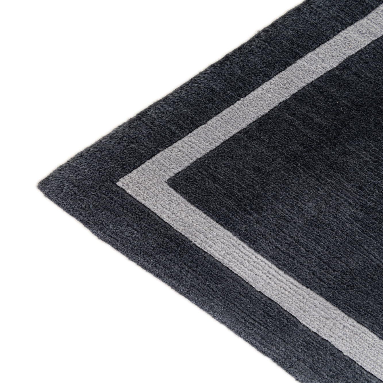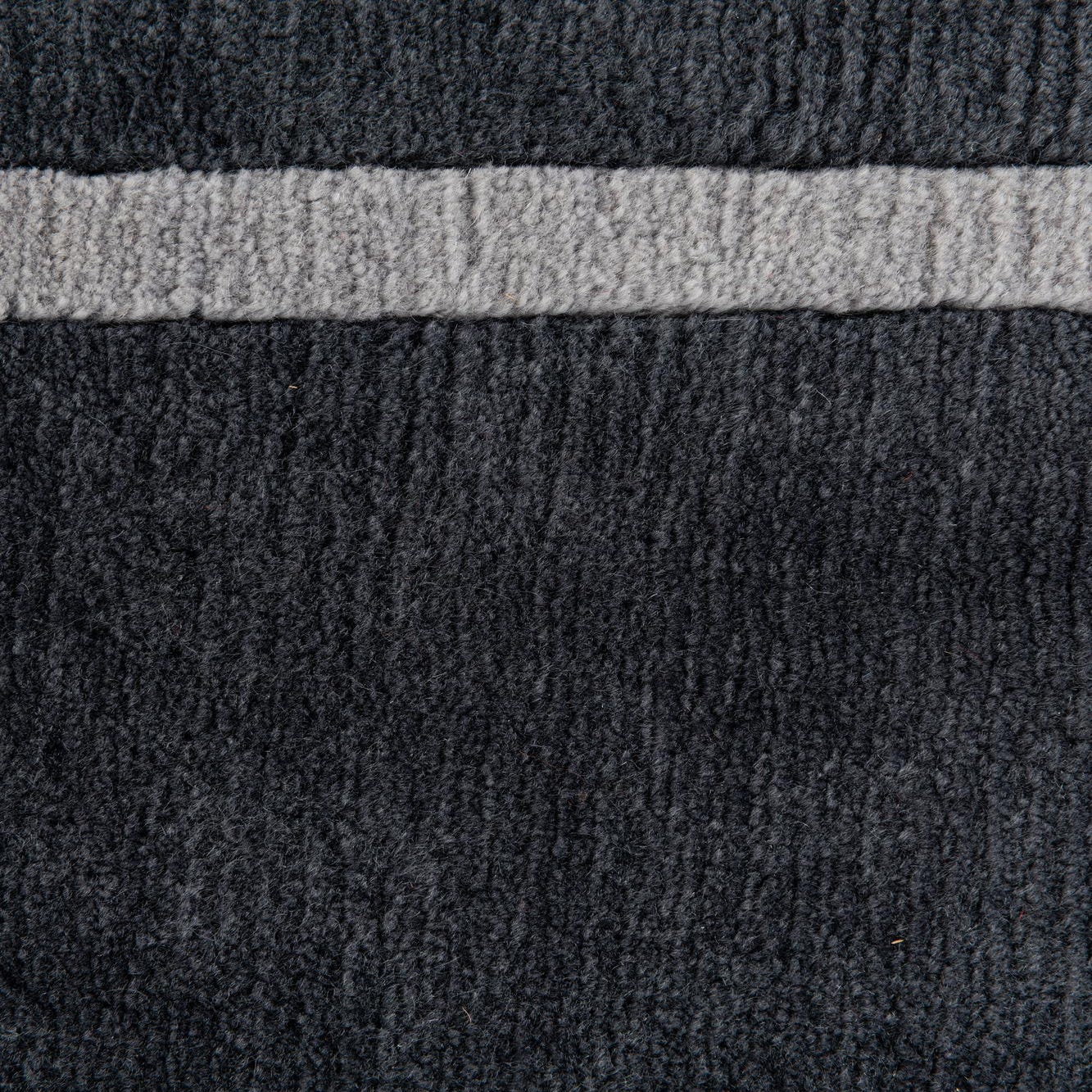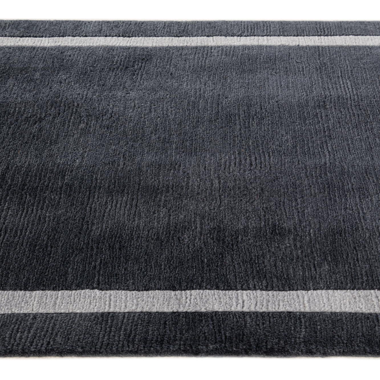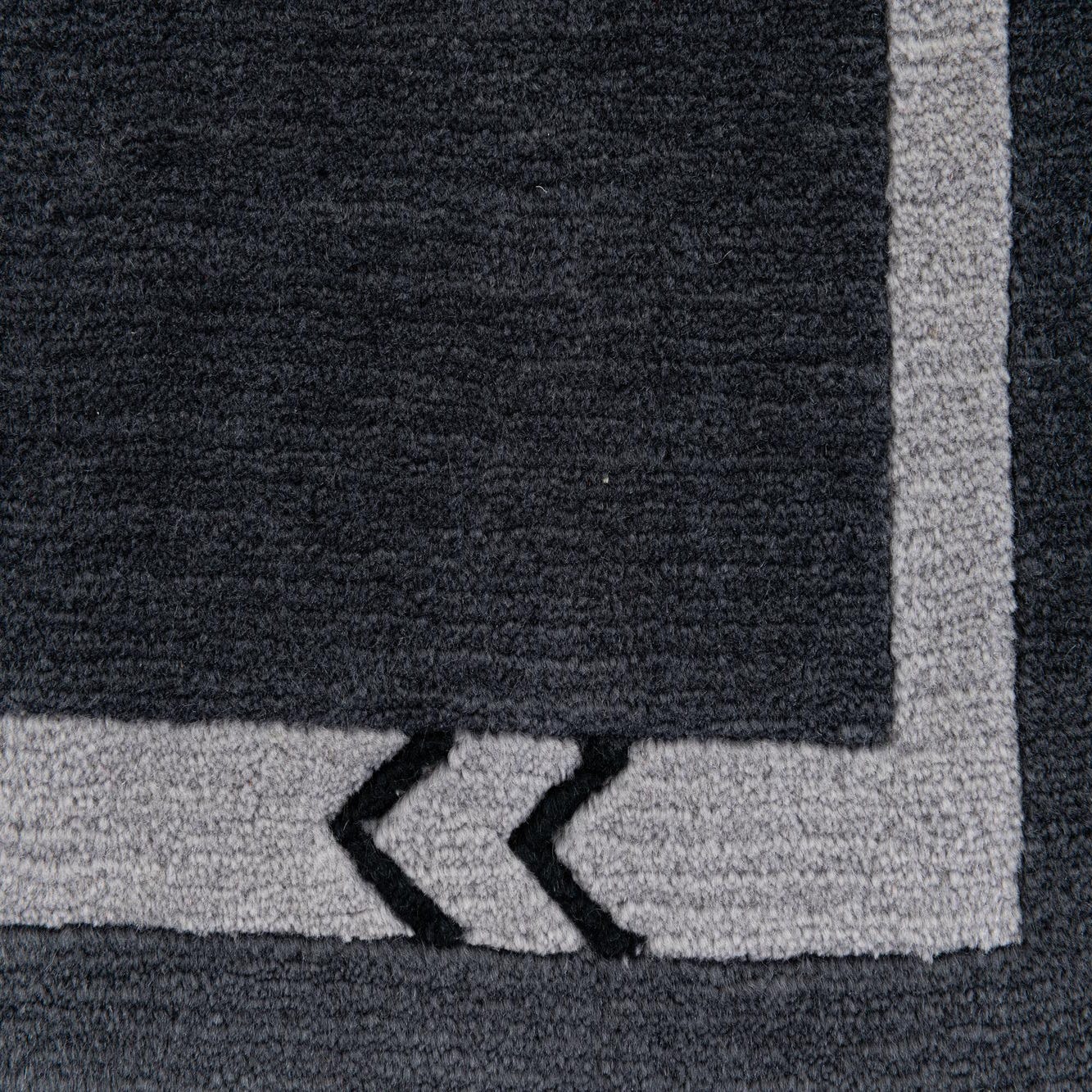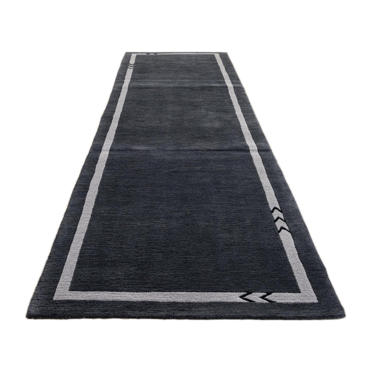 A long, dark gray 11 ft wool runner rug with a light gray border featuring black chevron patterns at the ends.