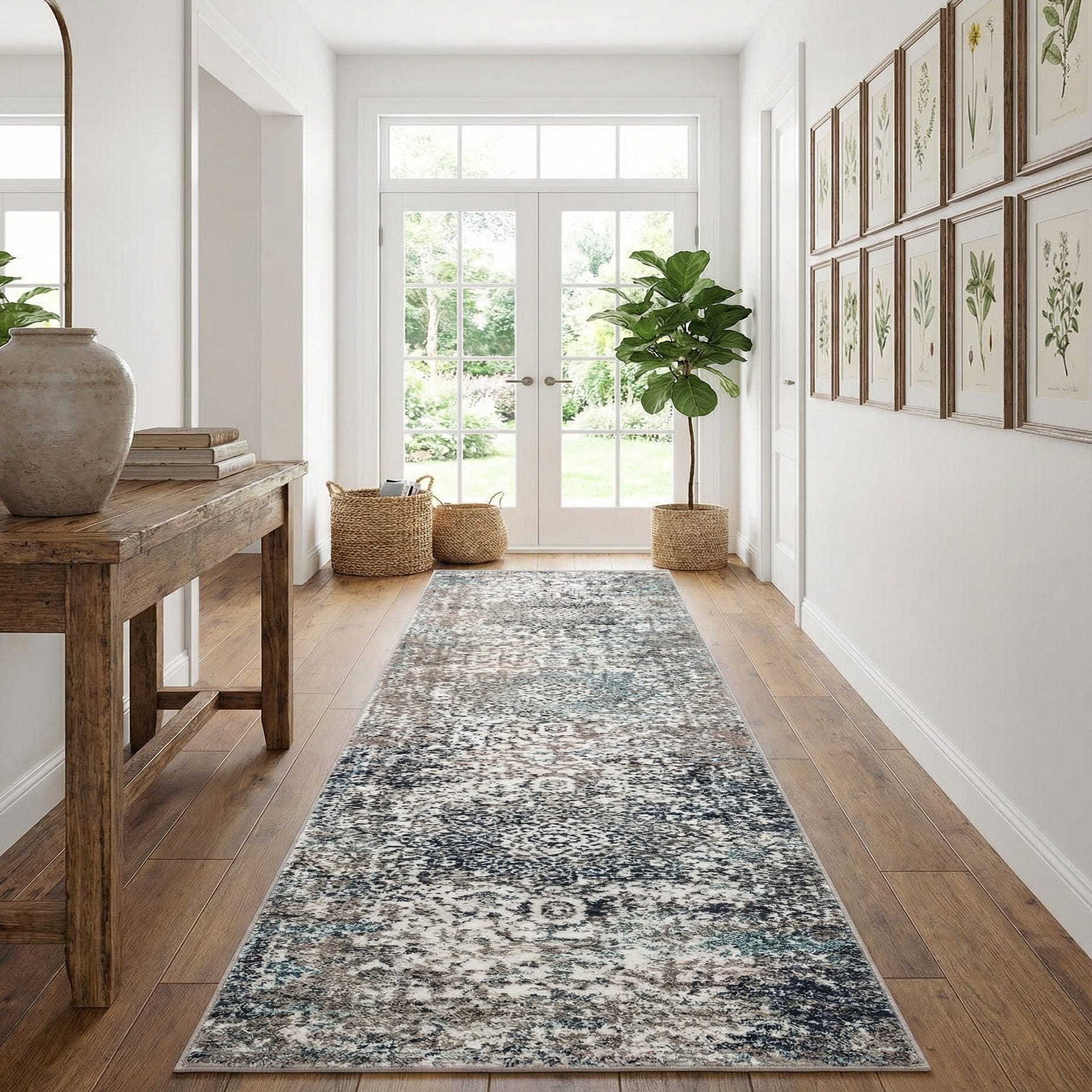 Sized and shaped as a runner, this design works well in hallways, entryways, and narrow kitchen or gallery spaces where you want pattern without overwhelming the room. The muted gray base and cool blue tones pair easily with light- to mid-tone wood floors, neutral upholstery, and metal finishes—suited to transitional, coastal-leaning, or contemporary interiors. Use it to lead guests through an open floorplan, add a layered look beside a bed, or anchor a long seating arrangement.