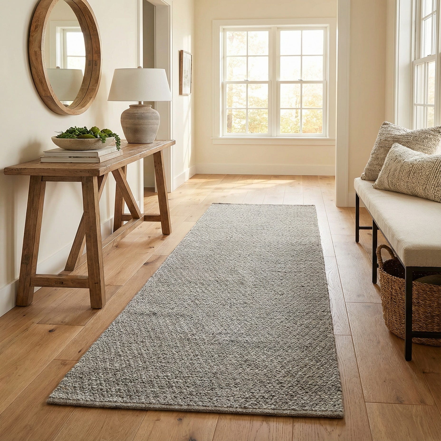 This runner fits well in narrow transitional spaces like hallways and entryways, and it works nicely alongside light wood floors, linen upholstery, and matte metal accents for a calm, modern look. It also complements Scandinavian, coastal, and contemporary interiors where a neutral palette and subtle texture help ground furniture arrangements; try it under a console table or layered with a larger area rug to add depth without overwhelming the room.