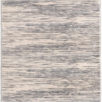 A muted, abstract striated pattern moves across a gray ground, layering ivory and beige with hints of blue and navy to create a soft, weathered look. Machine-made from 65% polypropylene and 35% polyester, the rug has a low-to-medium pile with a gentle, cushioned feel and a subtle luster where the polyester fibers catch the light. The irregular linear motifs add visual movement without a busy repeat, while the mix of cool grays and deeper navy accents provides balanced contrast.