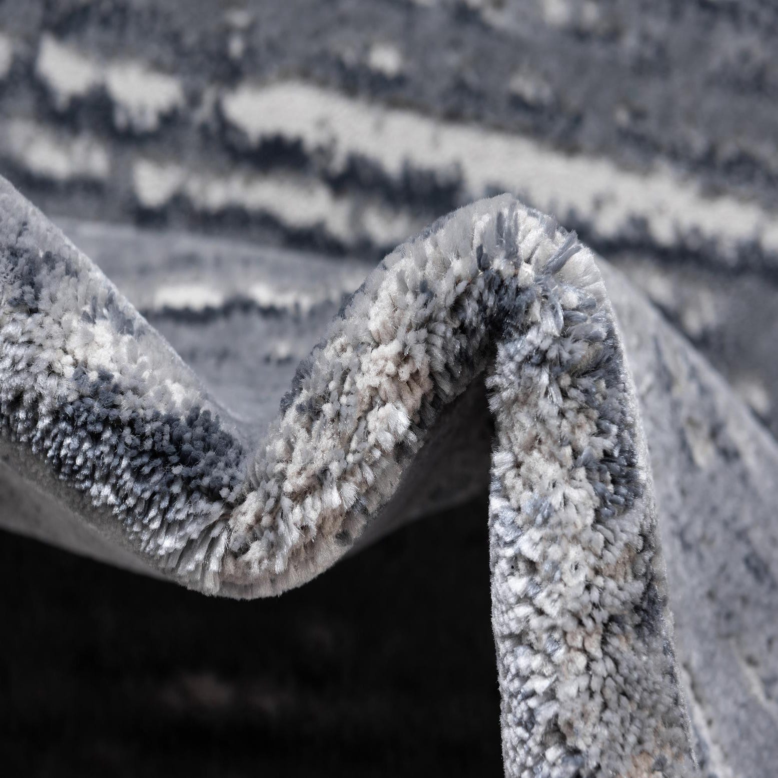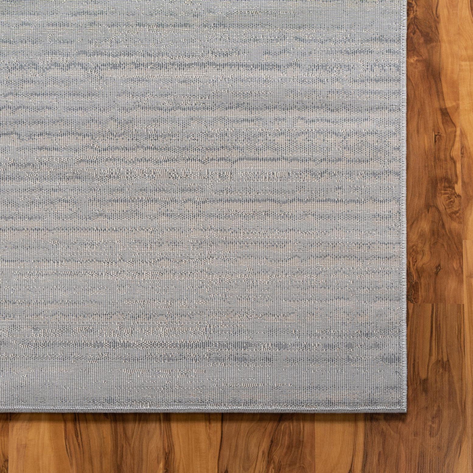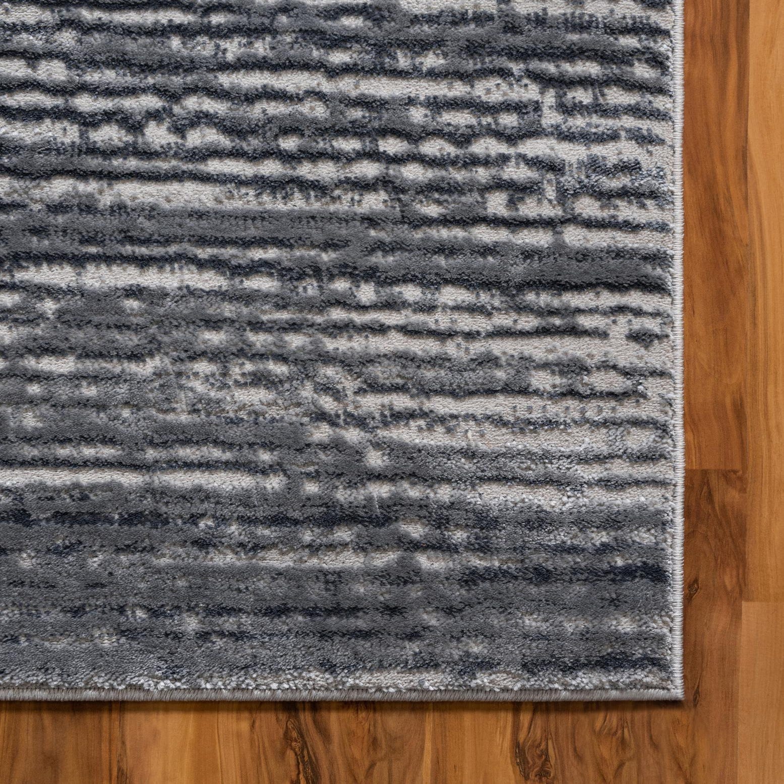 A tonal gray ground is patterned with irregular ivory striations that create a soft, linear effect across the runner. The abstract, striated motif keeps the look modern and understated, while the subtle contrast between gray and ivory adds visual depth without dominating a room. Finished with a clean bound edge, the overall appearance is streamlined and versatile.