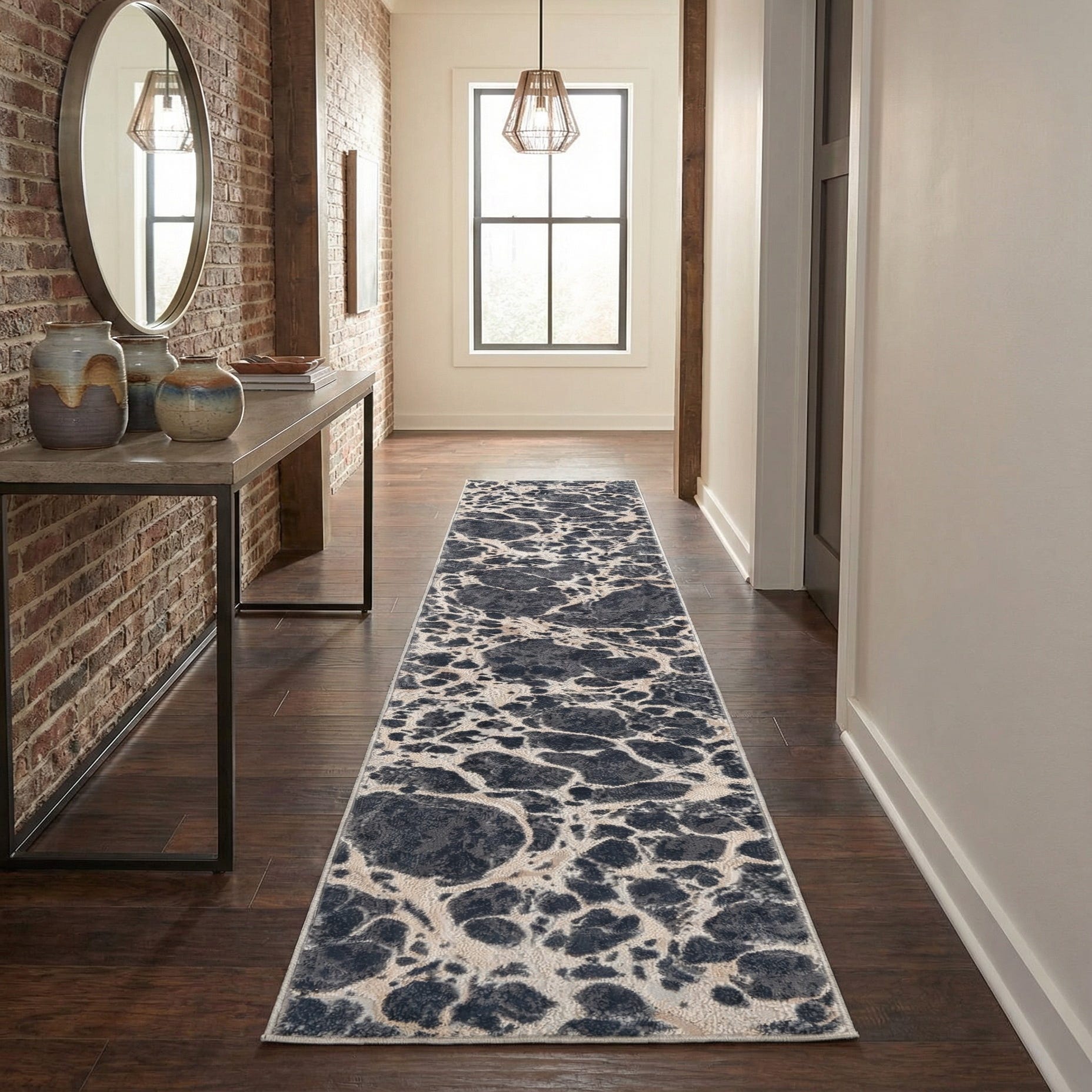 This runner works well in a variety of settings: place it down a narrow hallway or entry to add pattern without overpowering, layer it beneath a slim console in a transitional foyer, or run it along a kitchen aisle to warm up hard surfaces. It pairs neatly with light or medium wood floors, black or brass metal accents, and neutral upholstery—equally at home in modern, industrial, or relaxed contemporary interiors.