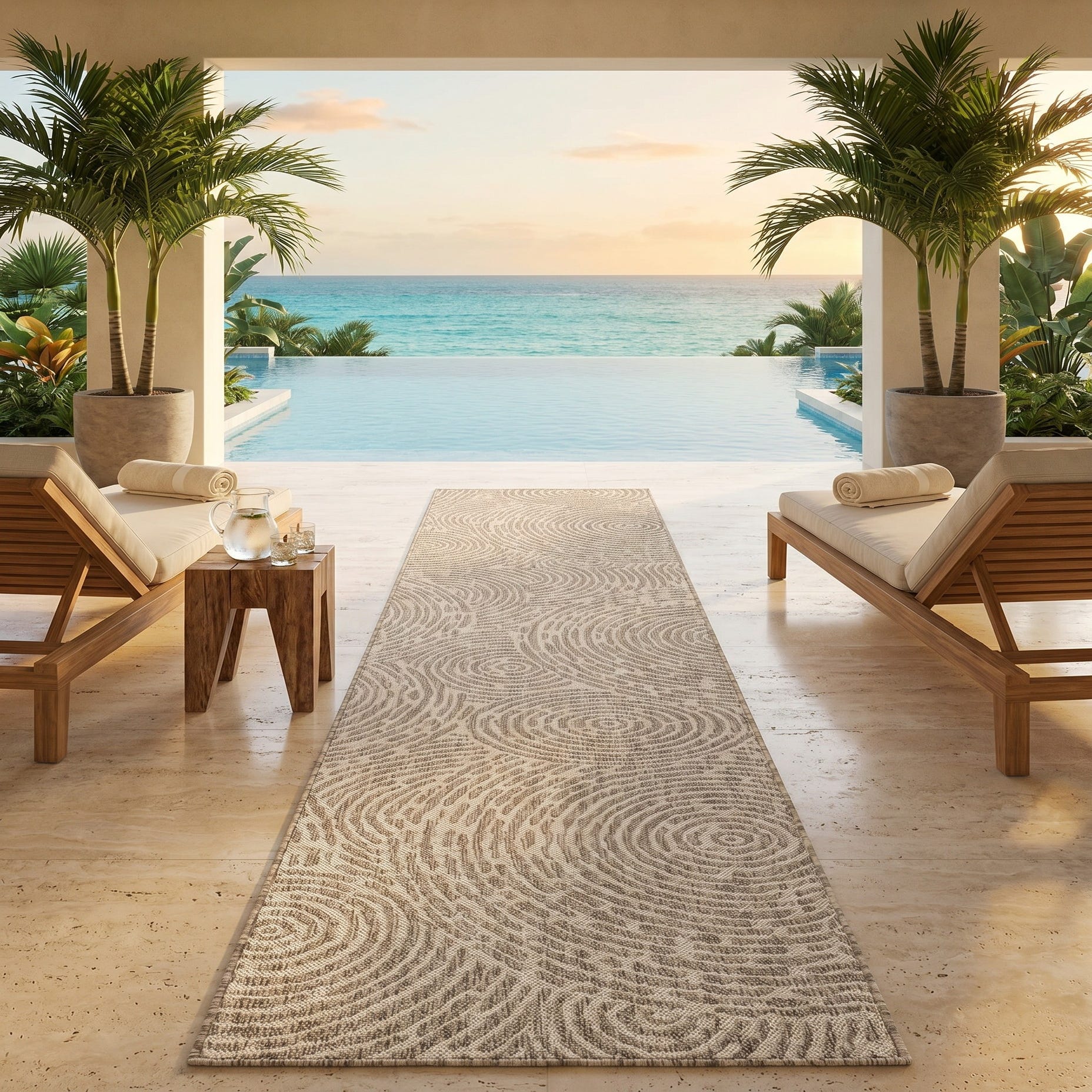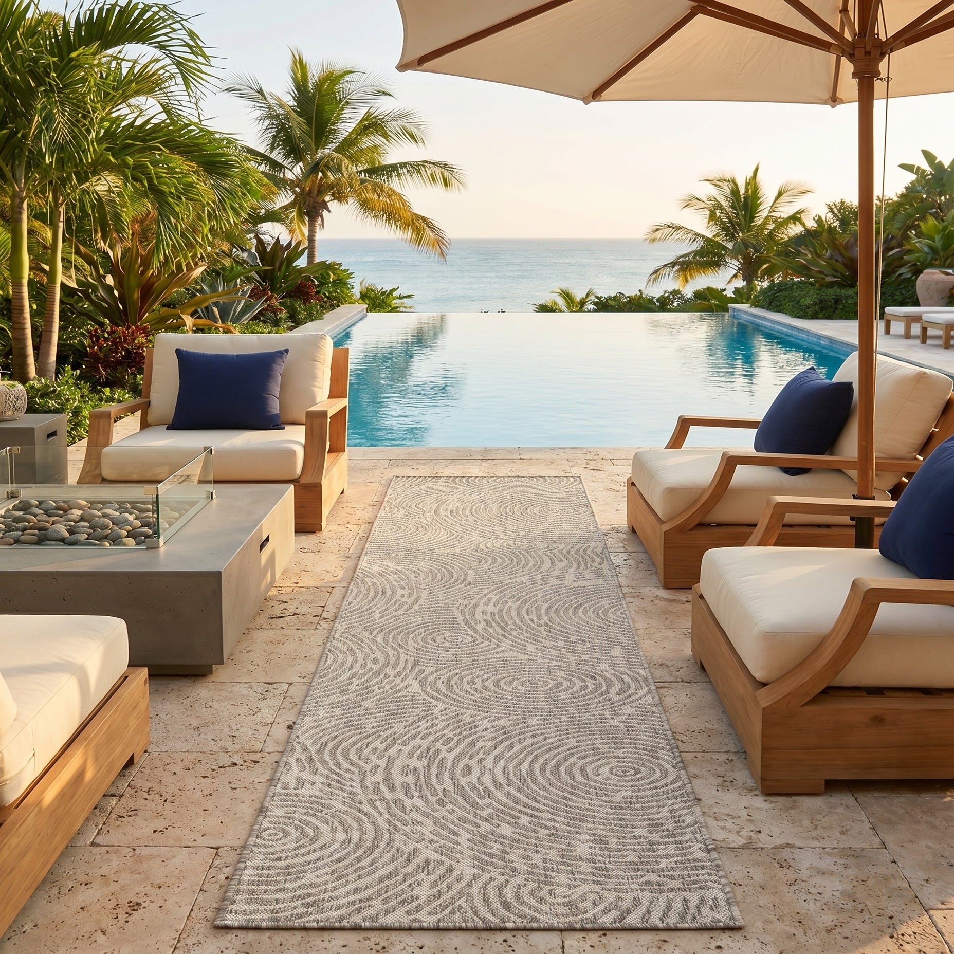 Love the contemporary look of this rug! We are so happy we chose this to accent the blue of our pool with our living area on our lanai. We still are going to add a few more pillows but love the rug to add color.
