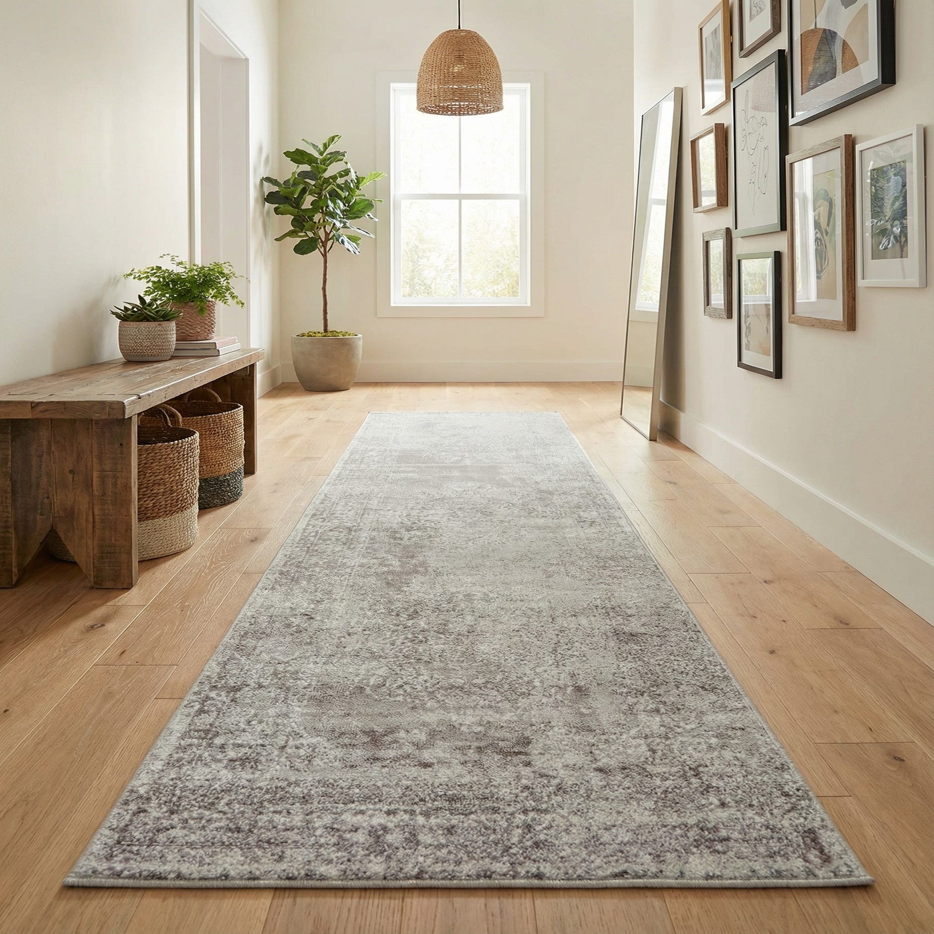 As a runner it’s well suited for long, narrow spaces—use it to define a hallway, entryway, or kitchen aisle where the muted pattern will help mask everyday traffic. It pairs easily with modern and transitional interiors, Scandinavian minimalism, or relaxed farmhouse schemes; try it over light hardwoods with white trim and mixed-metal accents, or place it along a bedside to add a soft, linear anchor to the room.