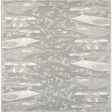 A 12 ft gray runner rug with a whimsical pattern of white owls and leafy branches, ideal for a hallway.