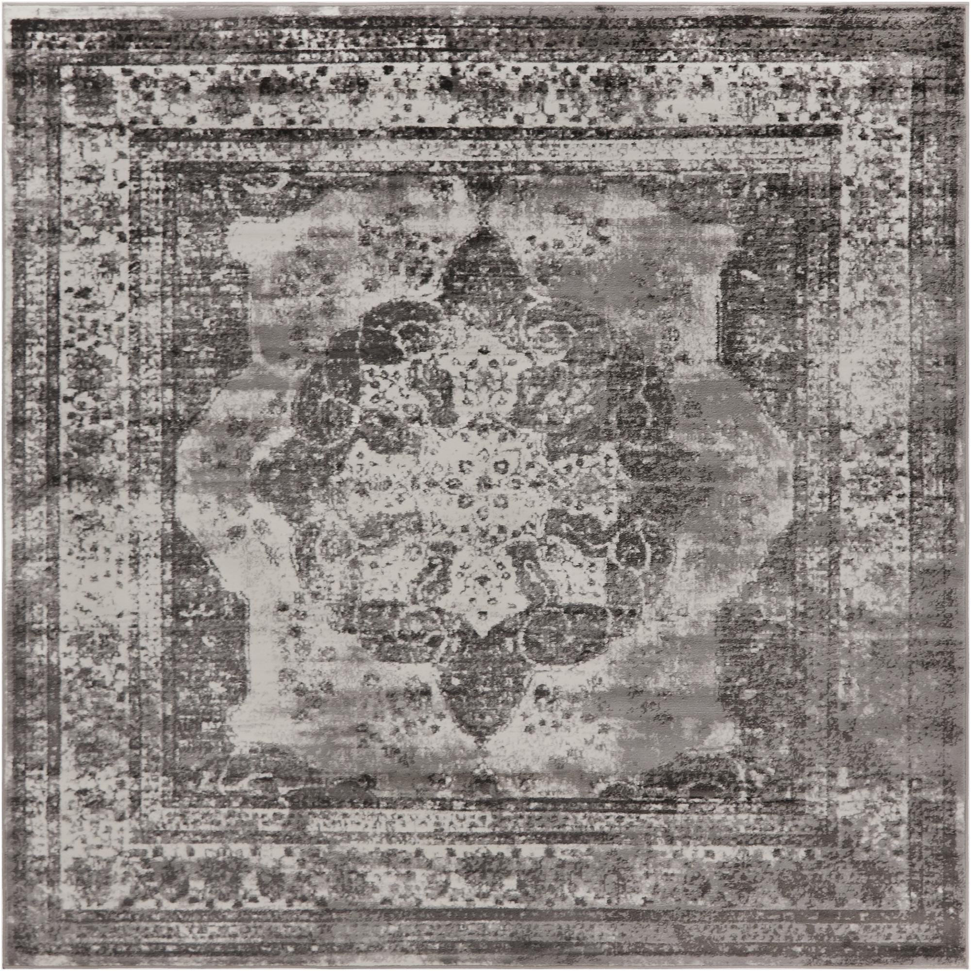 A worn-vintage medallion sits at the center of this rug, surrounded by layered borders and soft, mottled detailing that give the pattern a timeworn, lived-in character. The gray background provides a calm, neutral field while beige highlights pick out the floral and scrollwork motifs, creating a balanced contrast without feeling busy. The surface is a low, smooth pile with a slight velvety sheen; running your hand over it reveals a subtle texture where the pattern fades and reappears, adding visual depth to the floor. Made from 100% polypropylene, this rug combines a refined look with construction suited for regular use.