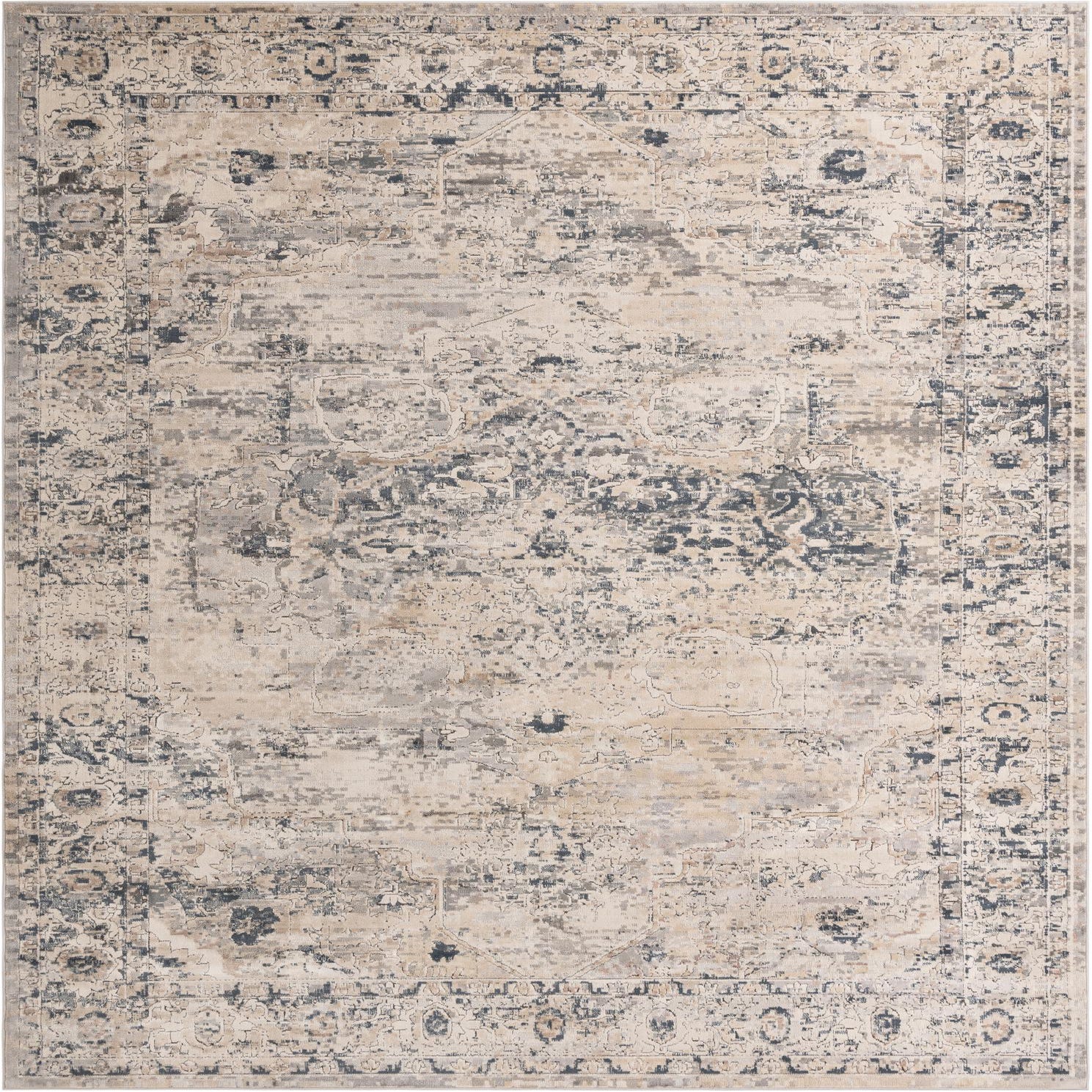 Primary color is Gray. Colors in this rug include: Gray, Beige, Blue.