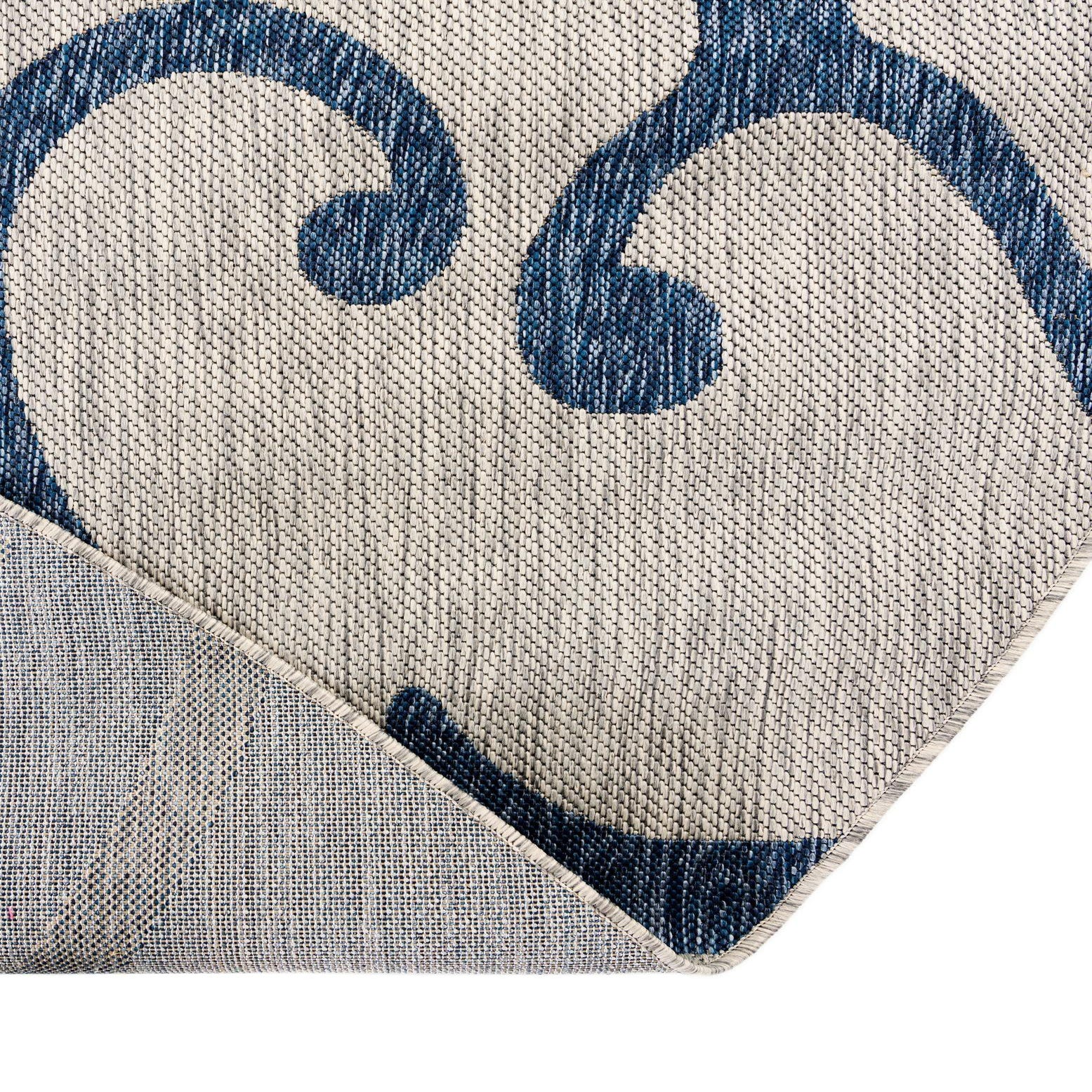 Softly textured against a gray ground, a scrolling botanical pattern in deep blue flows across this round rug in graceful, organic curves. The stylized vines form a balanced, open pattern that reads modern yet relaxed, while the low-profile weave gives the surface a subtle, tactile dimension—smooth underfoot with a gently raised motif that adds visual depth without bulk. Machine made from 100% polypropylene, the construction produces a flat, even face that lays neatly and complements both indoor and outdoor settings.