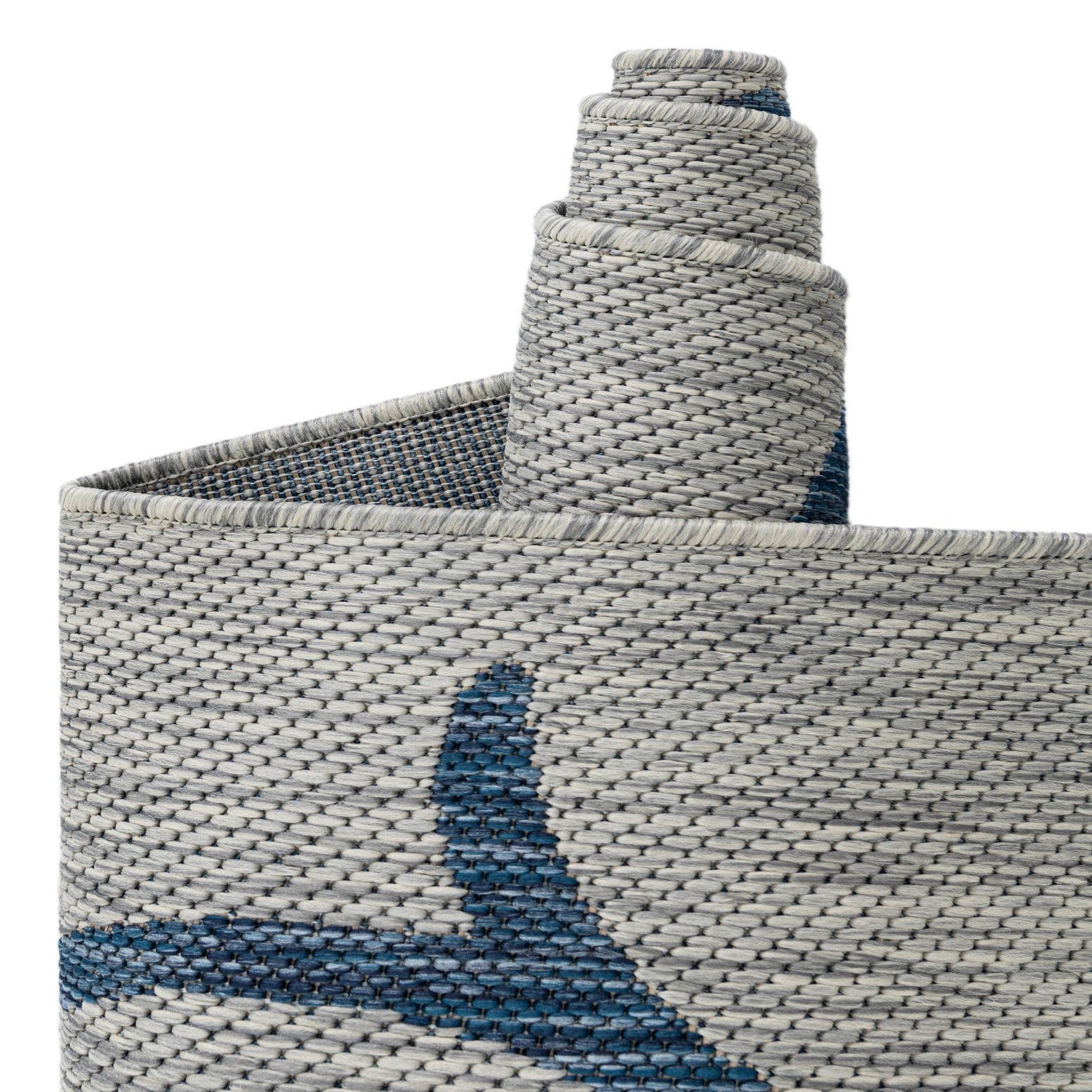 Place this rug beneath a round dining table on a covered patio, anchor a seating area on a screened porch, or add a calm, coastal touch to a sunroom. It pairs easily with natural wicker, weathered teak, navy or slate cushions, and light wood finishes, fitting transitional, coastal, and modern farmhouse schemes where cool grays and blues set a relaxed, composed tone.