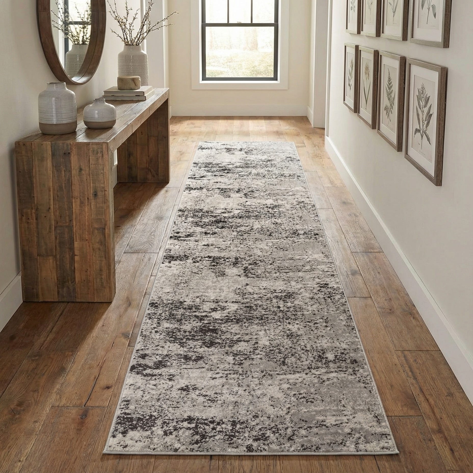 Built as a runner, this piece is well suited to long, narrow areas—hallways, entryways, alongside a kitchen island, or at the foot of a bed—where its neutral gray and ivory palette will anchor the space without competing with other finishes. It pairs naturally with modern and transitional furnishings, warm wood tones, matte metals, or a pared-back Scandinavian scheme, and can also provide balance in loft or industrial settings where softer texture and lighter tones are needed.