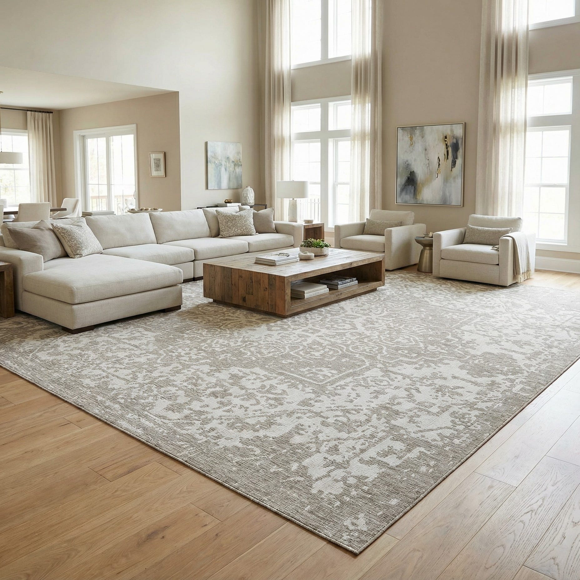 This neutral palette and traditional-yet-relaxed pattern make the rug versatile: it anchors a covered patio or sunroom as easily as it fits beneath a dining table or seating group in a casual living room. Pair it with natural woods, rattan or wicker, linen upholstery, and soft ivory accents for a coastal or farmhouse vibe, or use it in a contemporary setting to add layered texture without competing with clean-lined furniture.