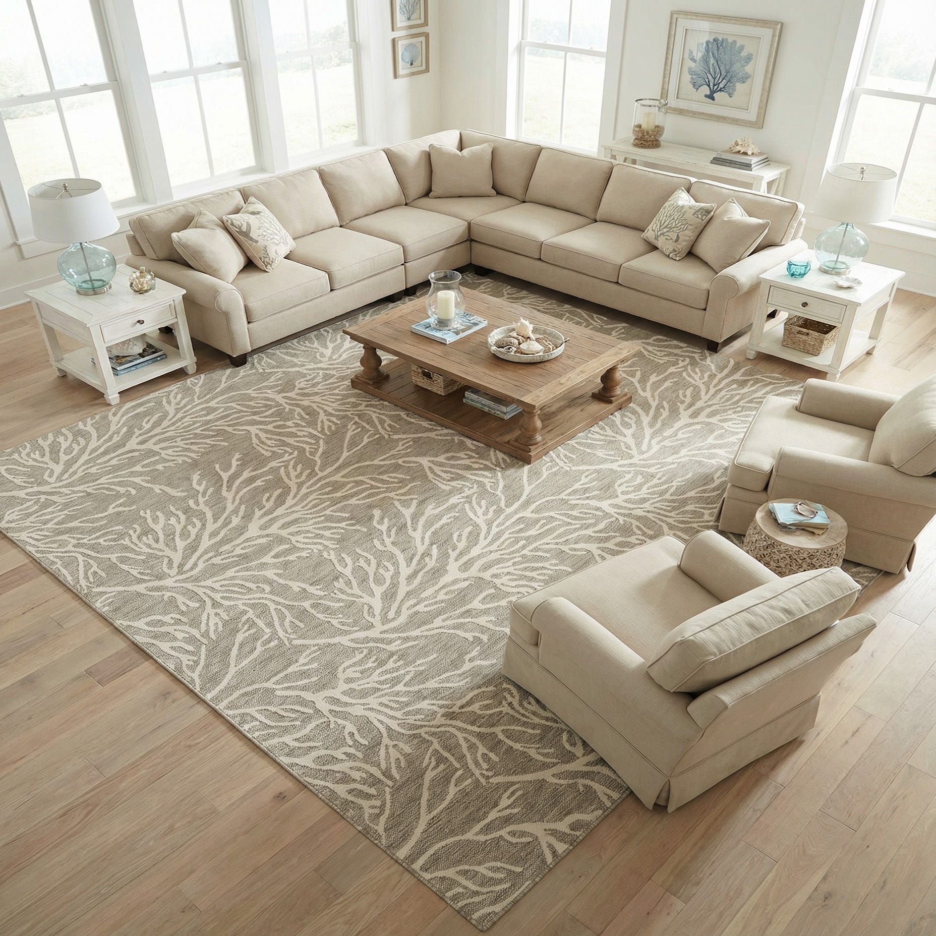This rug works well as an anchor for a covered patio or screened porch, a breezy sunroom, or a casual living and dining area in a beach house or coastal-inspired interior. Pair it with whitewashed wood furniture, woven rattan or wicker pieces, and navy or sea-glass accents for a layered coastal feel, or let it add subtle pattern and neutral grounding to modern, minimalist spaces.