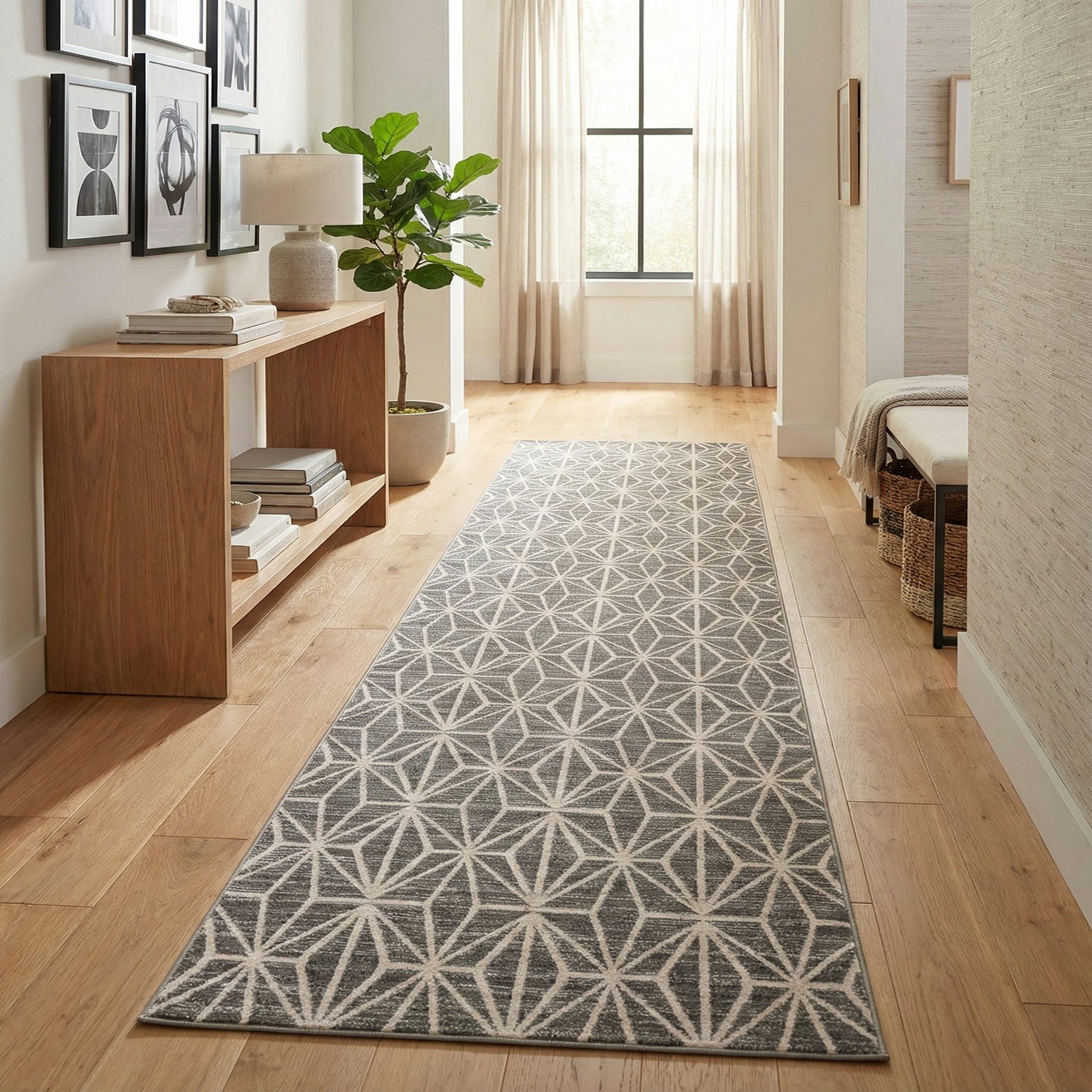 Machine-made from 70% polypropylene and 30% polyester, the rug has a low-profile, dense feel that lies flat underfoot while still offering a soft touch. Its proportions and pattern make it ideal for hallways, entryways, galley kitchens, or along the sides of a bed. Pair it with light-wood furnishings and matte metal accents for a Scandinavian or modern aesthetic, or use it to add structure to a transitional space with neutral upholstery and layered textures.