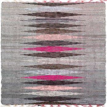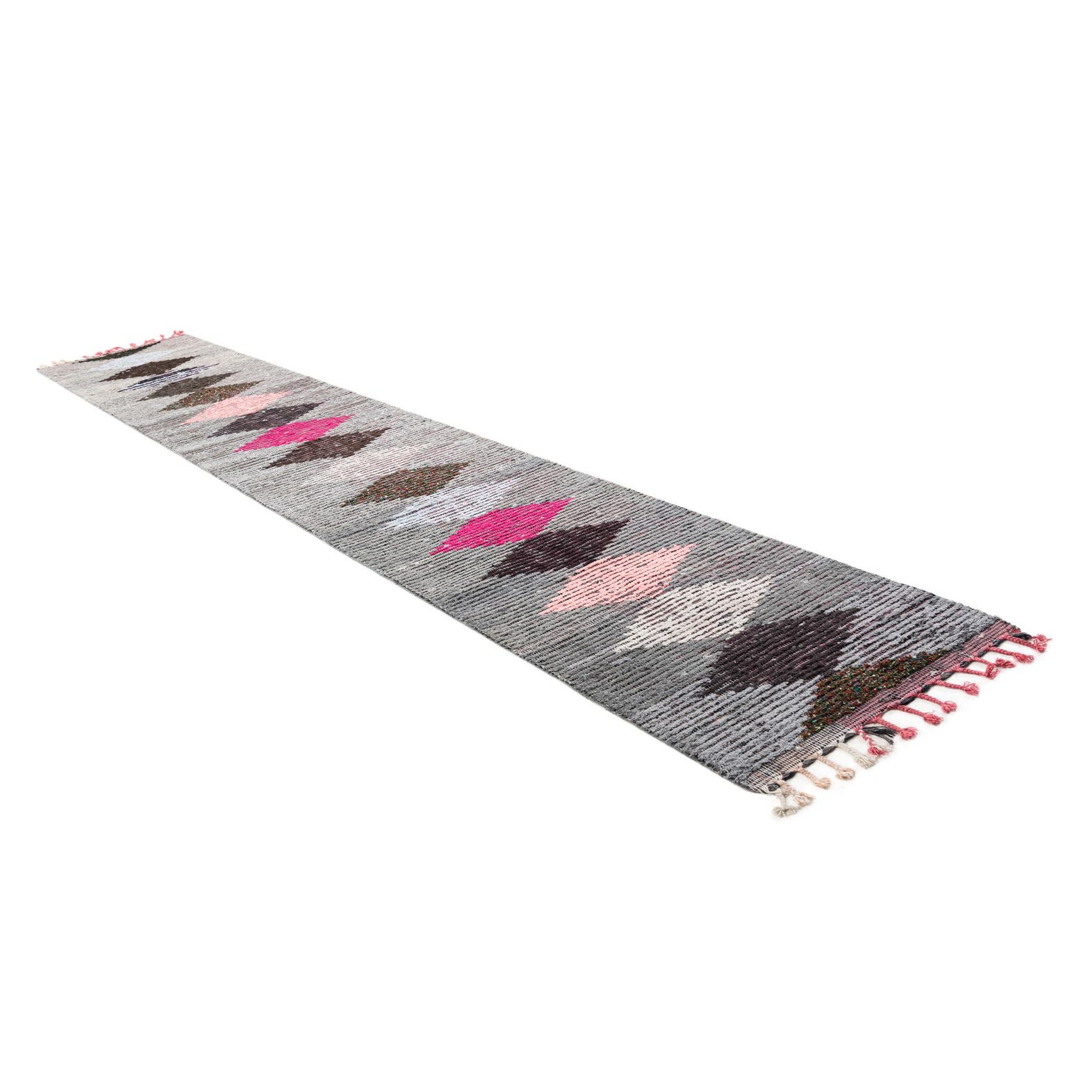 A gray 16 ft runner rug with a tribal pattern of alternating pink, white, and dark gray diamond shapes.