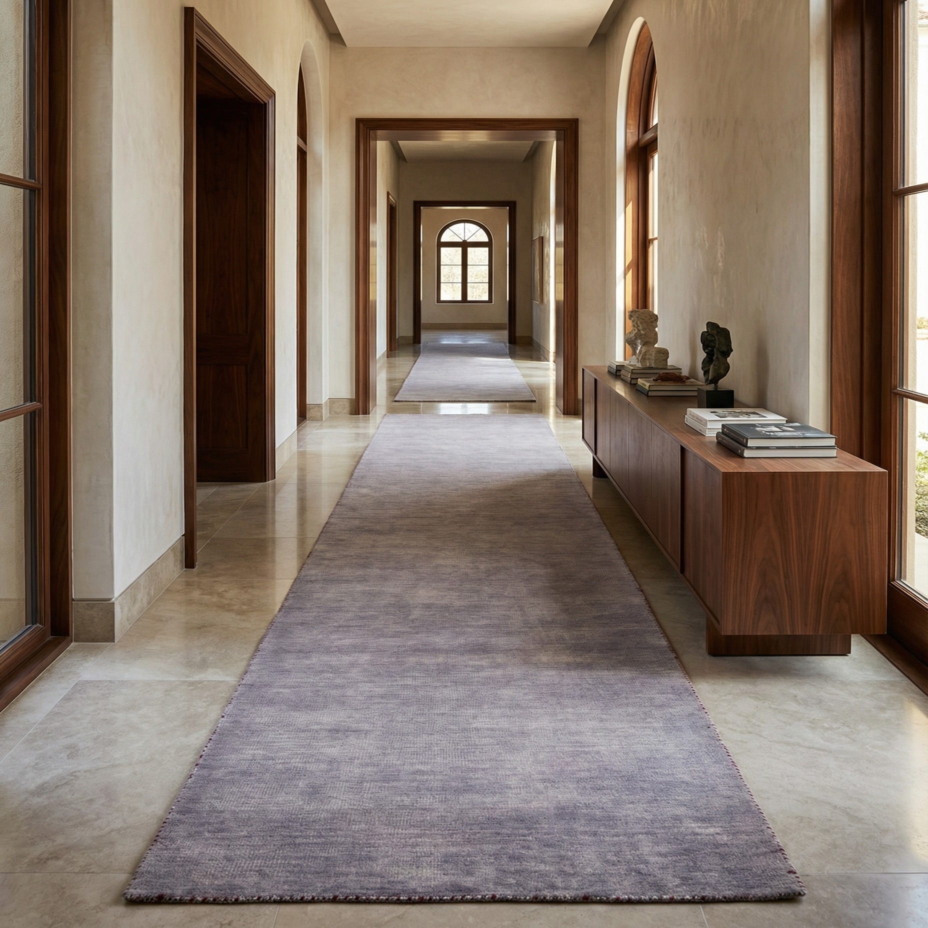 Designed for narrow spaces, this runner works well in hallways and entryways or alongside a bed to add quiet texture and warmth. It complements modern and transitional interiors—pair it with light woods and simple upholstery for Scandinavian-inspired rooms, tuck it beneath a slim console or bench in an entry, or use it to tie together a minimalist bedroom or office corridor where a muted, tactile foundation is desired.