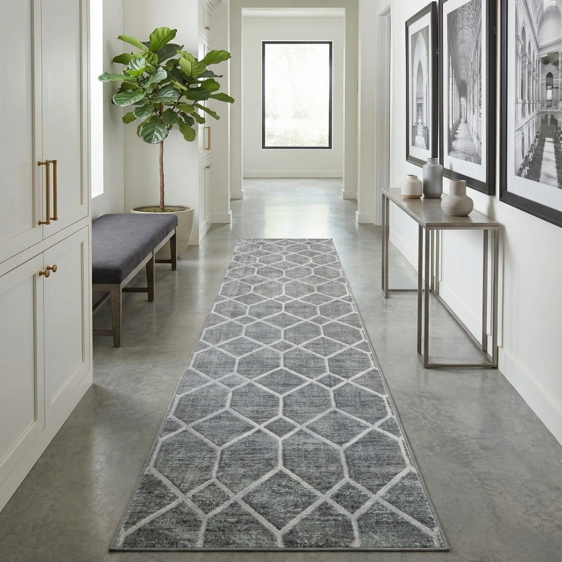 A long 20 ft runner rug in shades of gray and silver, featuring a modern geometric trellis pattern, ideal for a hallway.