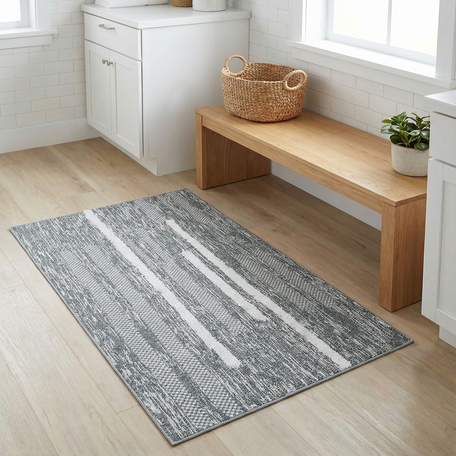 This rug's neutral color palette and minimalist aesthetic make it a highly adaptable piece that would seamlessly integrate into various interior design styles. It can serve as a subtle yet sophisticated accent in a modern minimalist setting or act as a gentle contrast against the rich textures of a Scandinavian-inspired room. Its modest size is perfectly suited for entryways, home offices, or as an understated complement to a cozy reading nook.