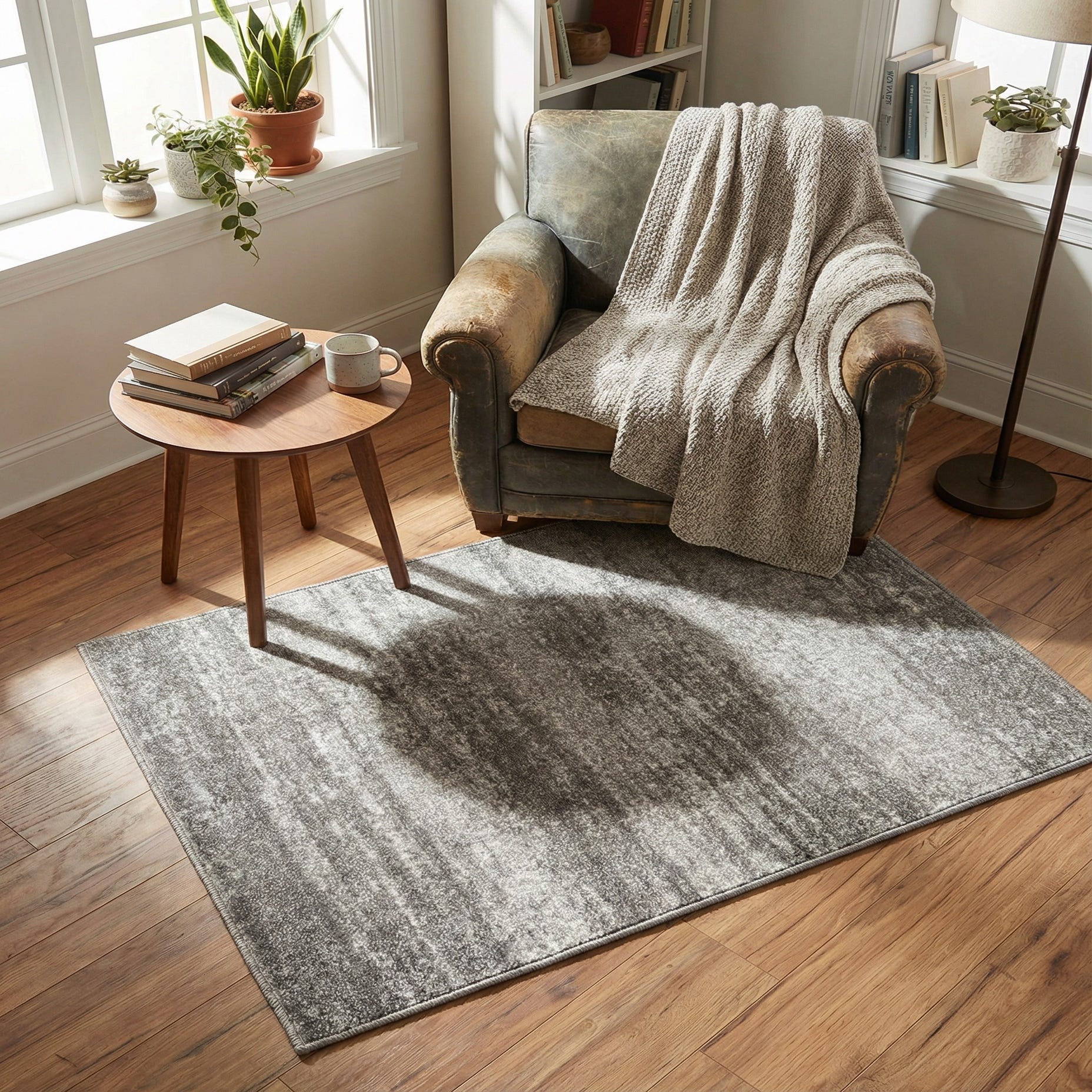 A soft-field design with a tonal, slightly weathered surface, this rug blends cool gray with warm beige highlights for a calm, layered look. The pattern is subtle and abstract—muted striations and gentle variations in tone create depth without a busy motif. Machine made of 100% polypropylene, the pile is low-profile and dense, offering a smooth, soft feel underfoot with a faint, low-sheen that catches light without glare.