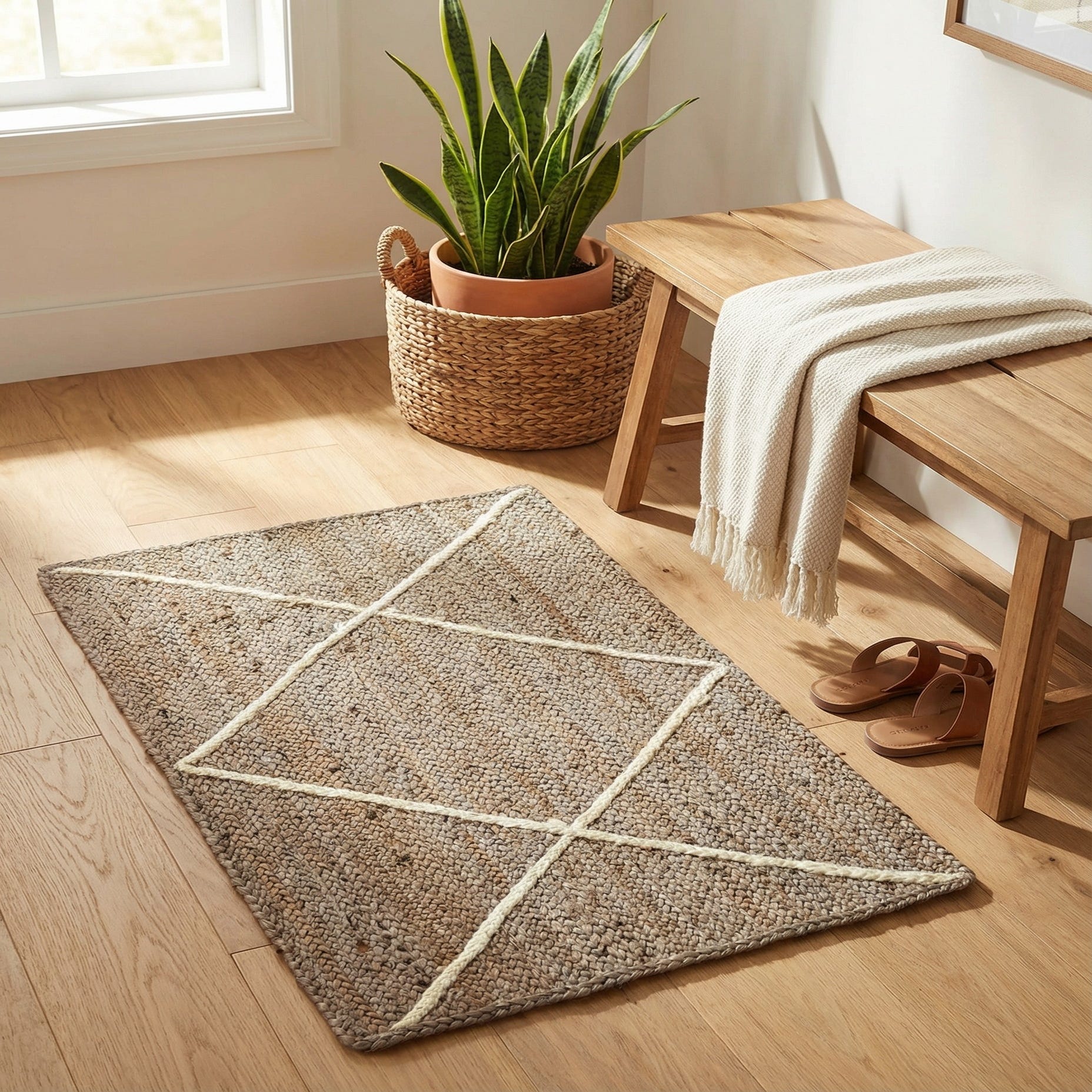 Hand-braided from 100% jute, this rug pairs a warm gray field with a soft ivory braided diamond motif that crosses the surface in clean, geometric lines. The braided construction creates a low-profile, textured weave you can feel beneath your fingers — tightly plaited jute fibers with subtle tonal variations that add depth without overwhelming the pattern. The ivory braids sit slightly raised against the gray background, giving the rug a tactile contrast and a handcrafted look.