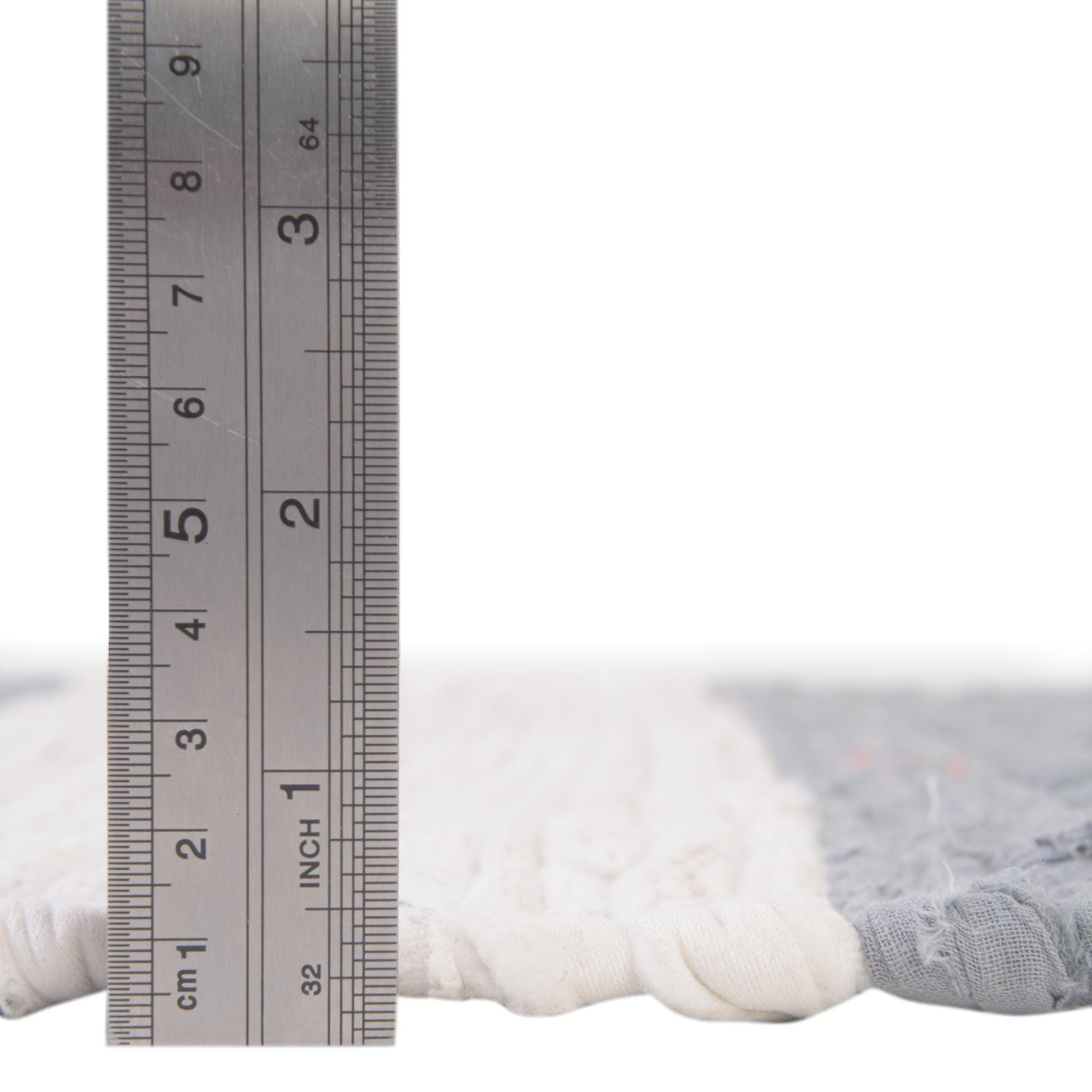 Hand-woven of 100% cotton, this flatweave rug displays broad horizontal stripes in a gray ground punctuated by clean ivory bands. The low-profile weave has a tactile, slightly nubby texture from the cotton ribbons—soft underfoot but with a firm structure that holds its shape. Hand-tied fringe at each end adds a casual, crafted finish that complements the rug’s straightforward stripe pattern.