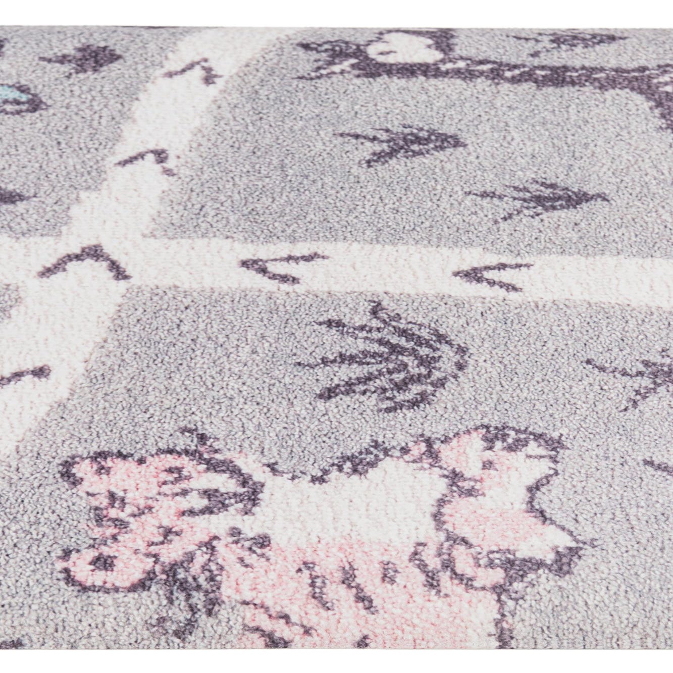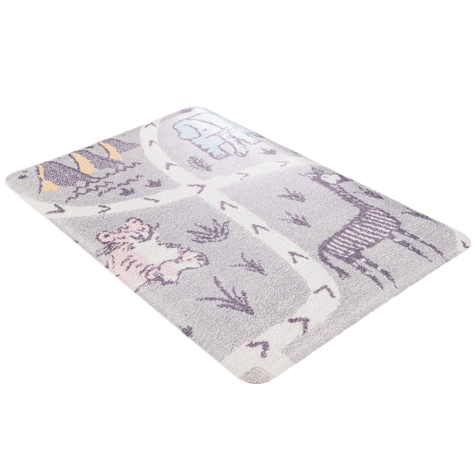 A rectangular gray rug with a modern safari animal pattern, featuring a blue elephant, pink tiger, and striped giraffe with white roads.