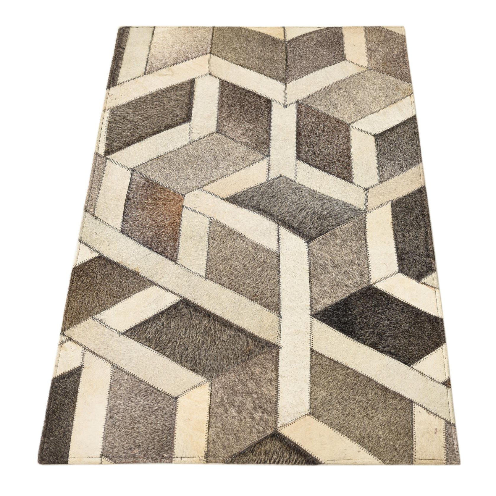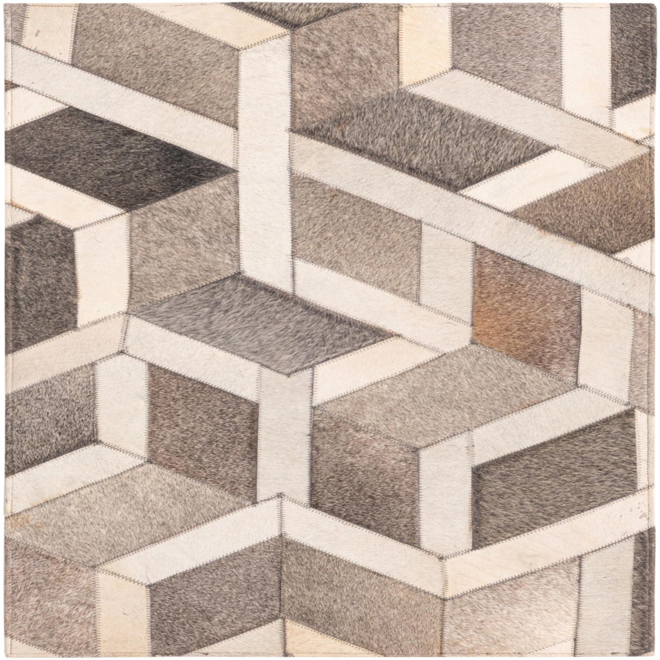 A 2x3 rectangular Cowhide rug with a modern geometric pattern in varying shades of gray, silver, and cream.