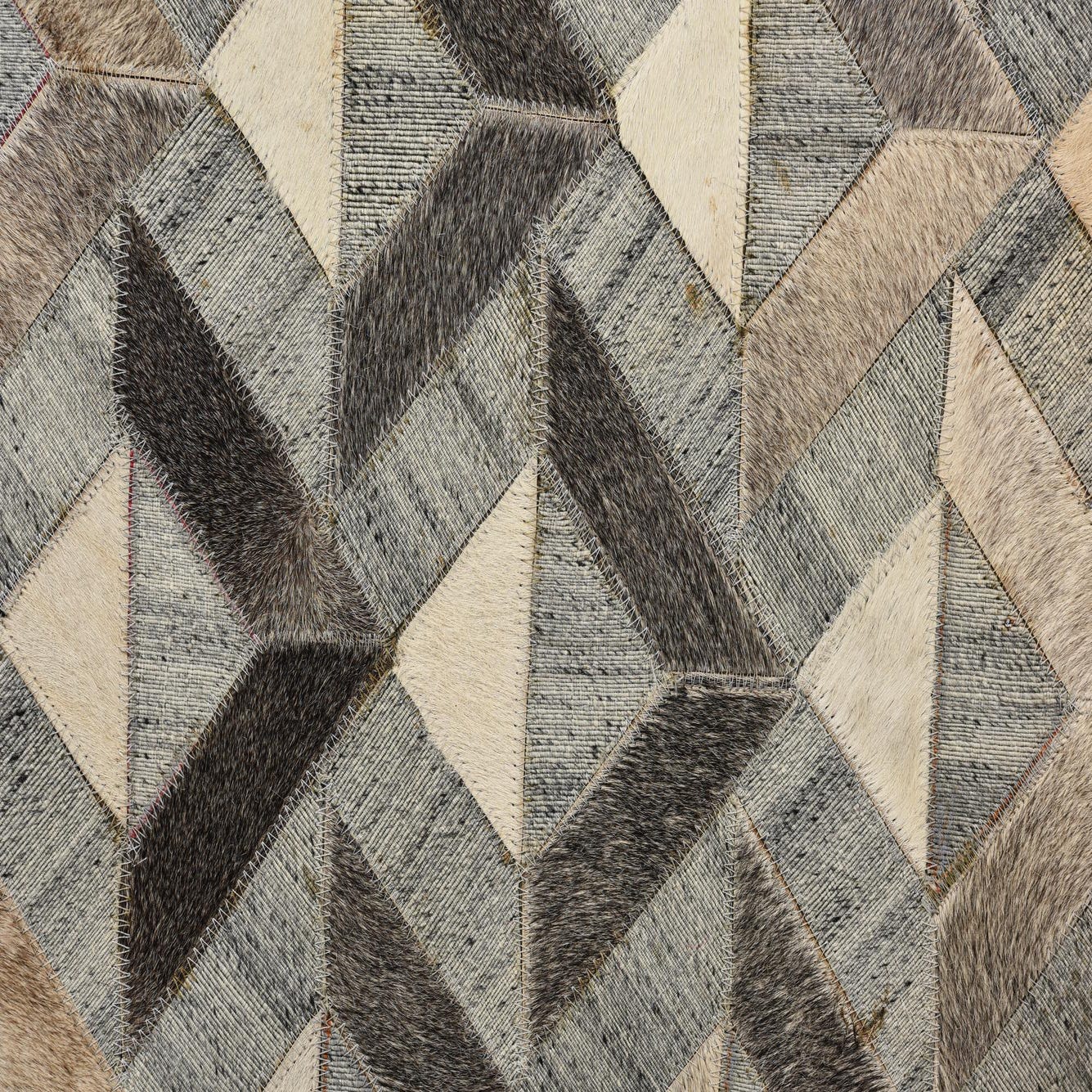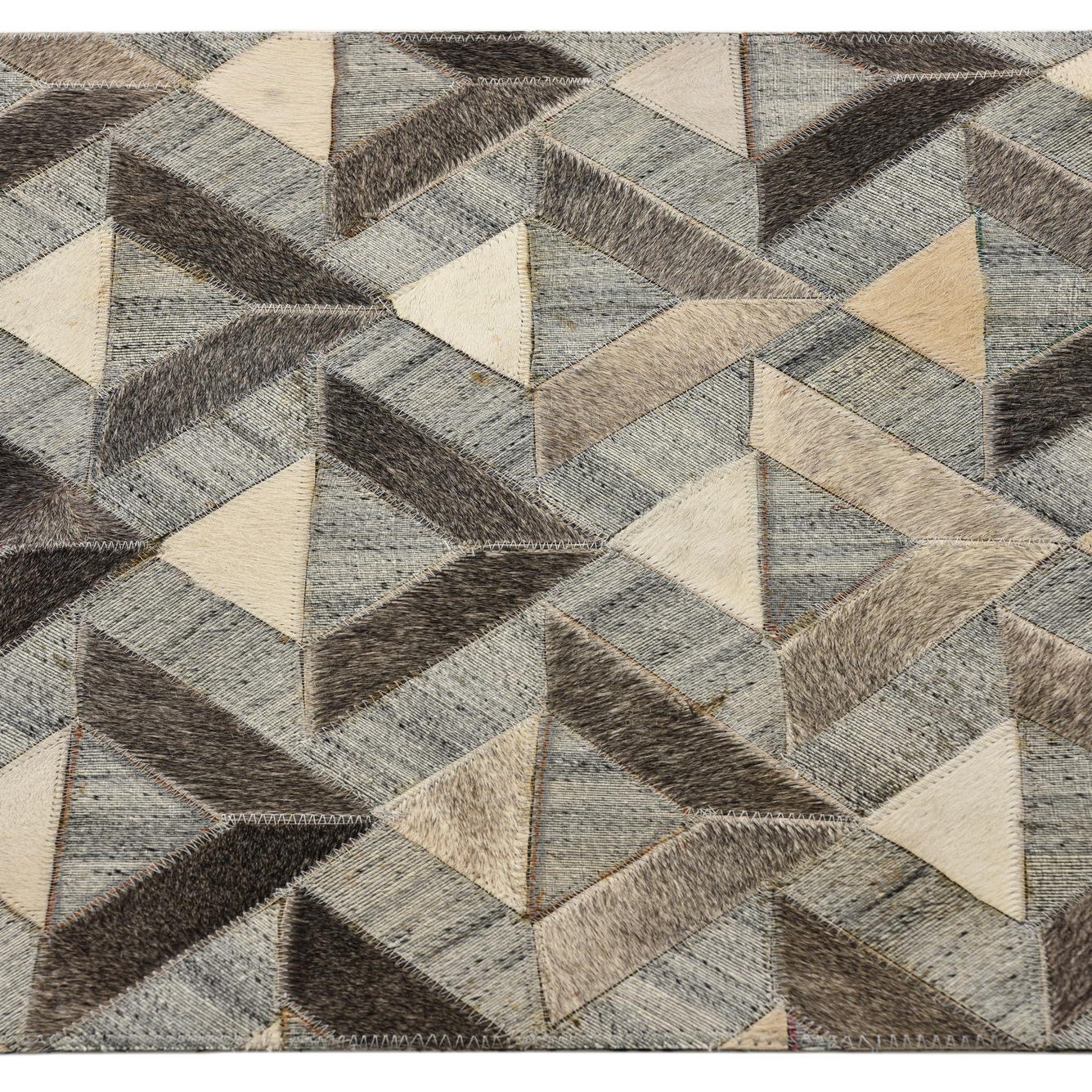 A geometric patchwork of triangular and chevron motifs sits on a soft gray field, assembled from hand-cut pieces of cowhide and leather. Triangles of brown, beige, ivory and touches of black form a repeating, three-dimensional rhythm across the surface, with the hair-on-hide pieces arranged so their natural nap and direction create subtle shifts in tone and sheen. Tight, visible stitching outlines each patch and reinforces the handcrafted construction; the mix of smooth leather and fur-on-hide gives a layered tactile quality you can both see and feel.