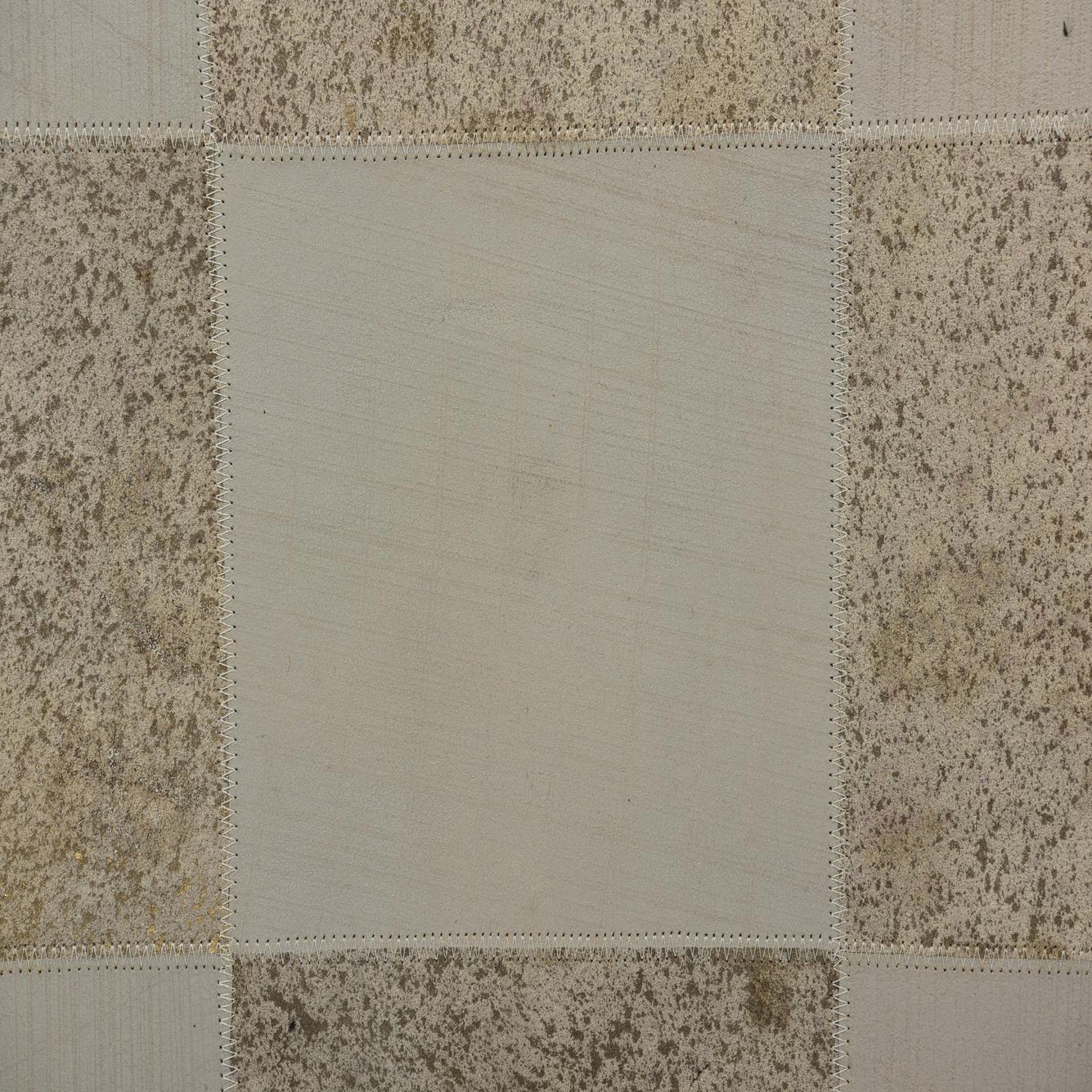 2x3 rectangular Cowhide Leather rug featuring a modern patchwork design in varying shades of gray and silver.