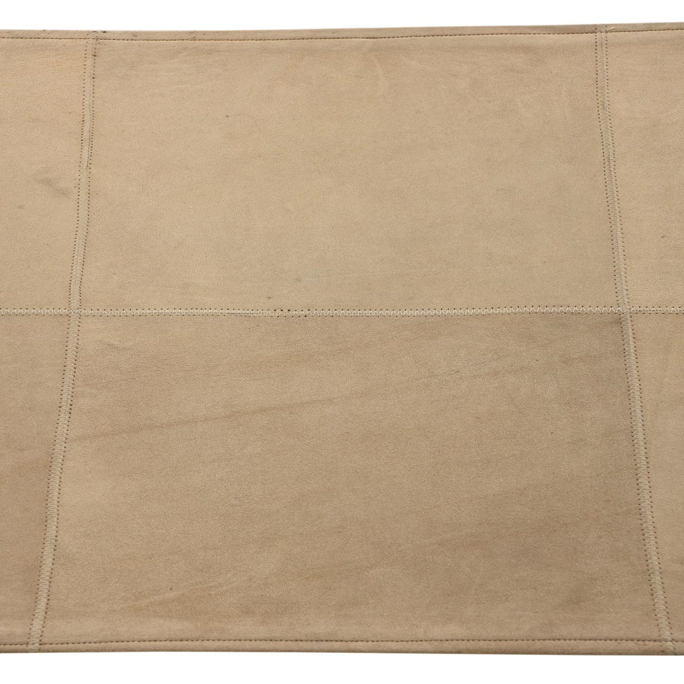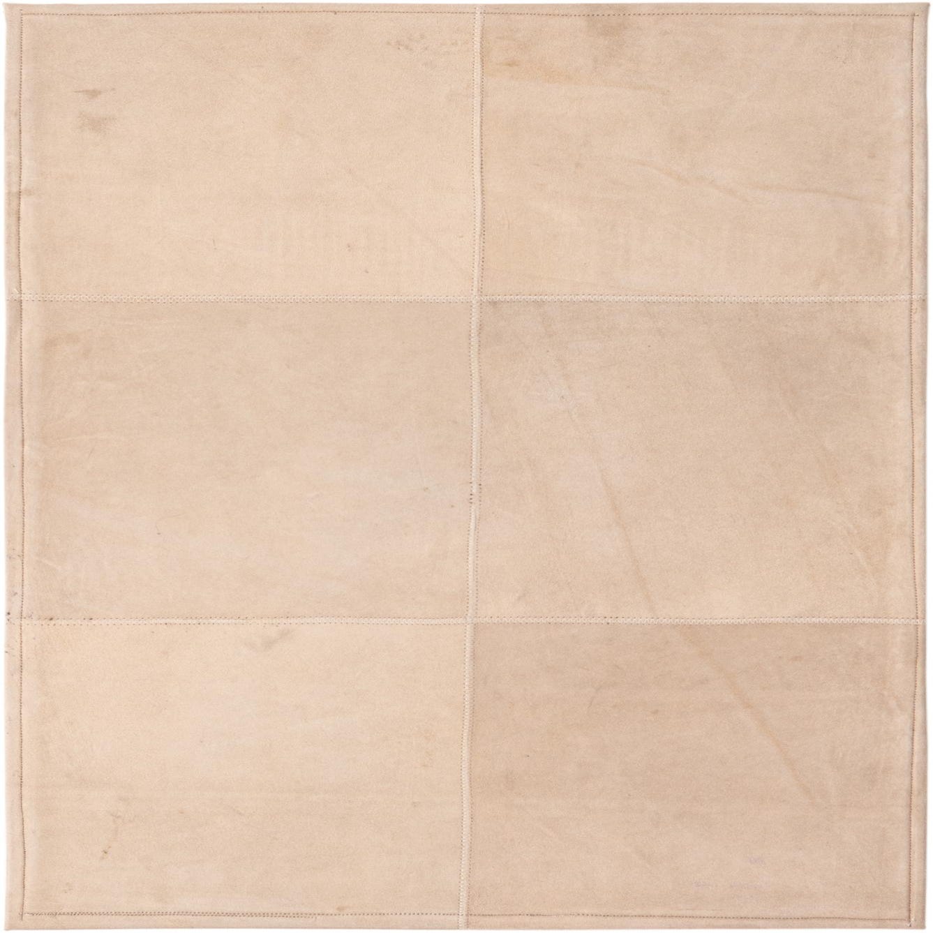 A muted gray field anchors this hand made cowhide and leather rug, laid out in a quiet patchwork of beige panels separated by neat, visible stitching. The pattern is simple and geometric — rectangular sections form a subtle grid that adds visual structure without calling attention away from surrounding pieces. Running your hand across the surface reveals a soft, suede-like nap with the smooth give of leather; the stitched seams bring a slight texture contrast that reads as artisanal and intentional.