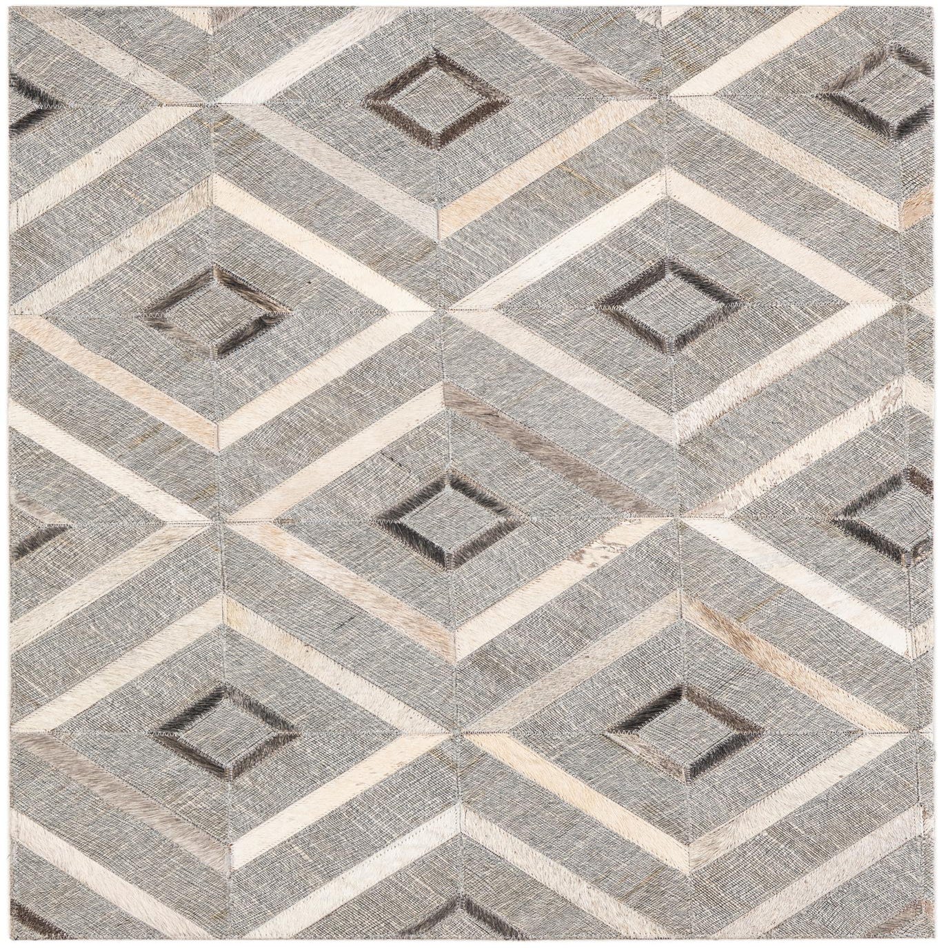 A 2x3 rectangular gray and silver cowhide rug with a modern geometric diamond pattern, ideal for an entryway or kitchen.