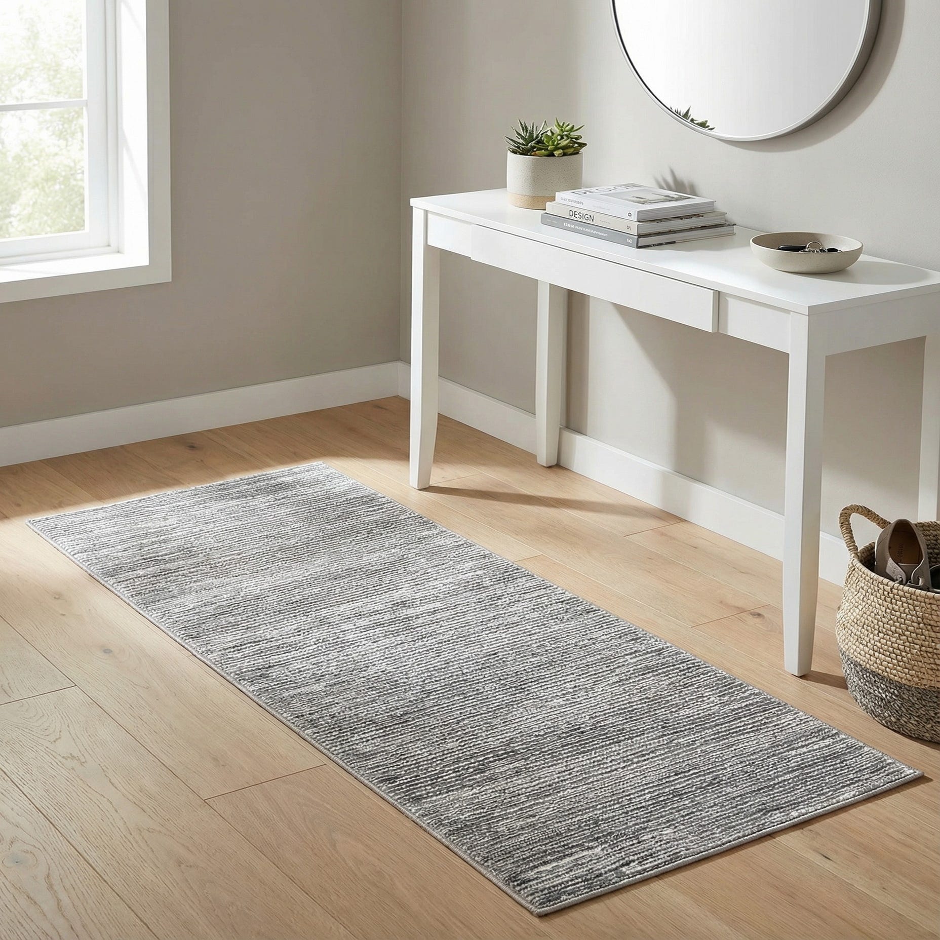 A 2x3 rectangular Finsbury rug in varying shades of gray, featuring a modern textured high/low pile pattern.