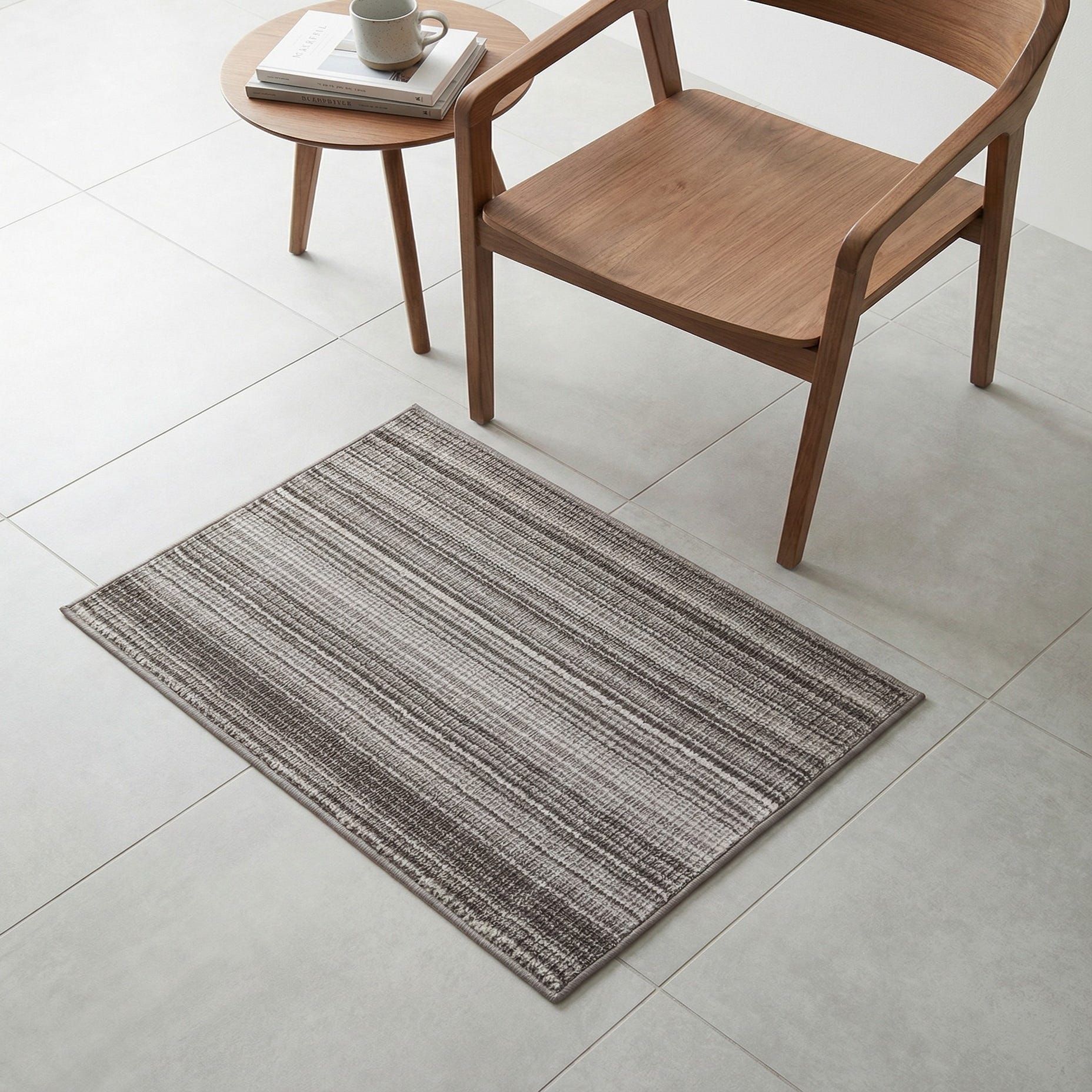 Machine-made from polypropylene, the rug has a low, slightly ribbed pile you can feel underfoot — soft enough for bare feet yet structured enough to hold its shape in active areas. Its compact proportions work well in small entryways, in front of a sink, layered over a larger floor covering, or placed beside a bed to define a cozy bedside spot. Pair it with clean-lined furniture, metal accents, and light woods for a Scandinavian or modern-minimal look, or use it to soften industrial and monochrome interiors.