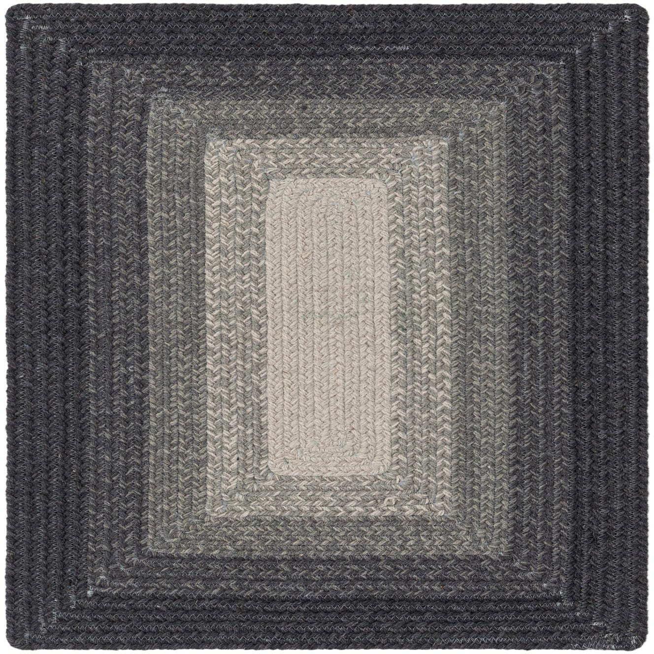 Concentric rectangular braids form a simple, grounded pattern that moves from a warm, light center outward to deeper tones. The background color is gray, graduating through soft pewter and slate into a rich charcoal border. Hand-braided of 100% wool, the surface has a pronounced braided rib and a dense, woolly hand—soft to touch with a low, cushioned loft underfoot.