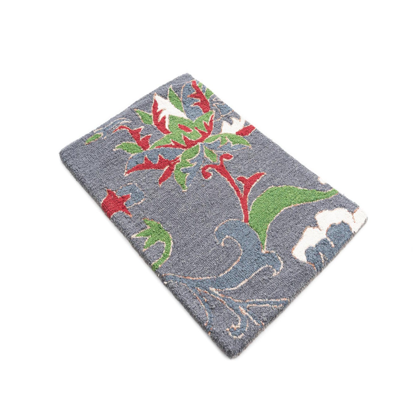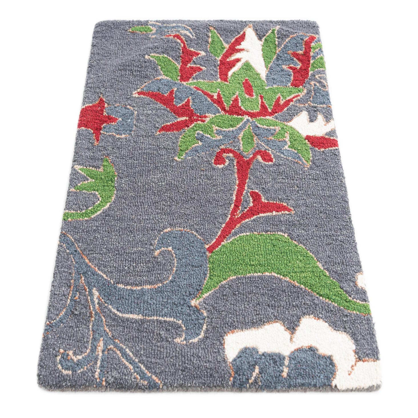 This Luna Collection rug is a visually engaging piece, hand tufted of wool and cotton, and measures 2 feet by 3 feet. The design showcases a traditional pattern with a modern twist, featuring botanical motifs that boast a blend of gray, green, red, ivory, and brown colors on a gray background. The intricate detailing gives this rug a sense of depth, while its rich palette allows for versatility in various design schemes.