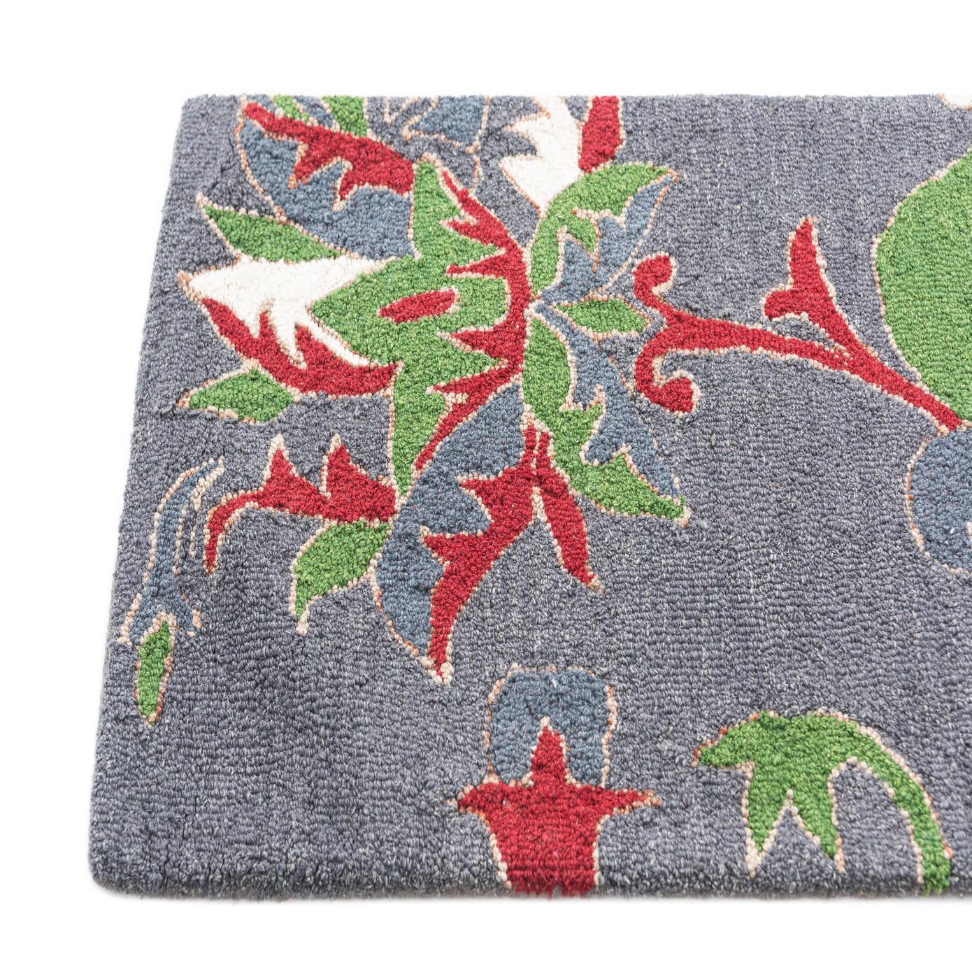 Primary color is Gray. Colors in this rug include: Gray, Green, Red, Ivory, Brown.
