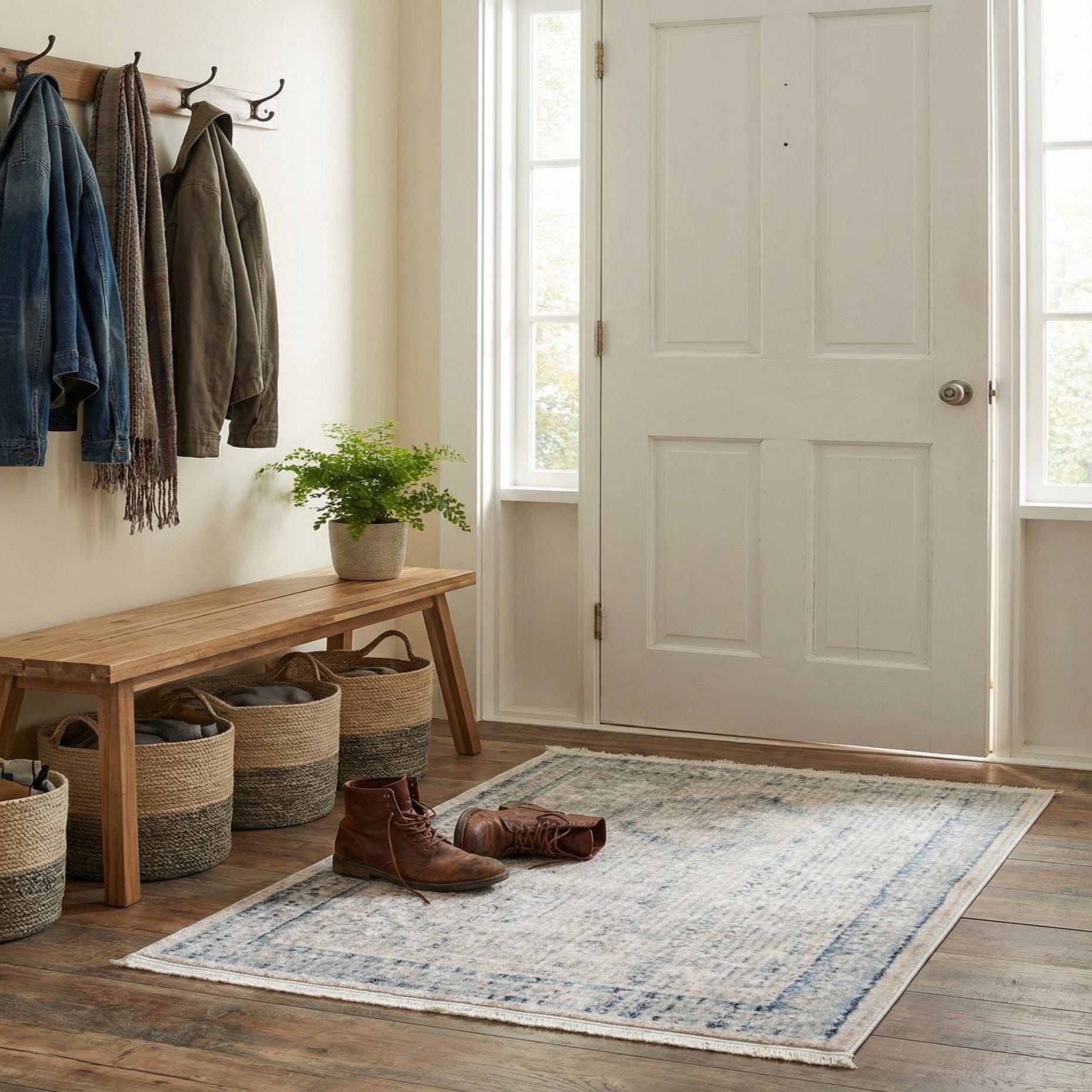 The muted palette and low-profile texture make this rug a versatile choice for small areas and layered arrangements—place it beside a bed, under a small coffee table in a reading nook, or at an entry to add a touch of color without dominating the space. Pair it with light wood tones, navy accents, and ivory textiles for a coastal or transitional scheme, or layer it over a neutral larger rug to introduce subtle pattern and color. Its polyester construction keeps the surface smooth and color-rich, making it easy to integrate into everyday interiors.
