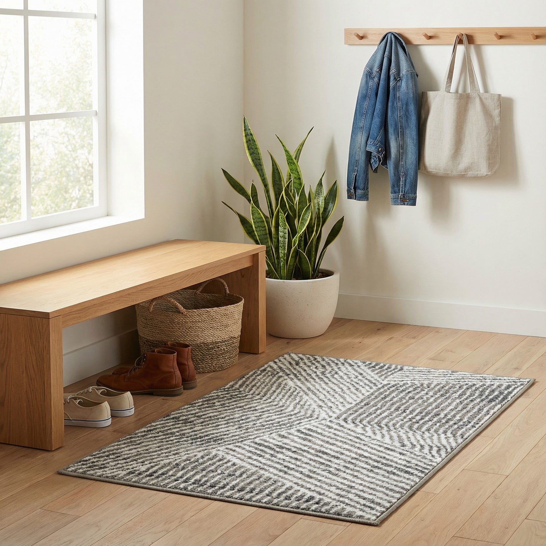 A geometric, tone-on-tone design gives this rug a modern, layered look. Angled ribbed stripes form interlocking blocks across a gray ground, with ivory ribs that create subtle contrast and movement. The pattern reads crisp and contemporary without harsh lines, and the neutral gray and ivory palette lets the design anchor a room while staying quietly versatile. Machine made of 100% polypropylene, the construction highlights the defined, raised ribs across the surface.