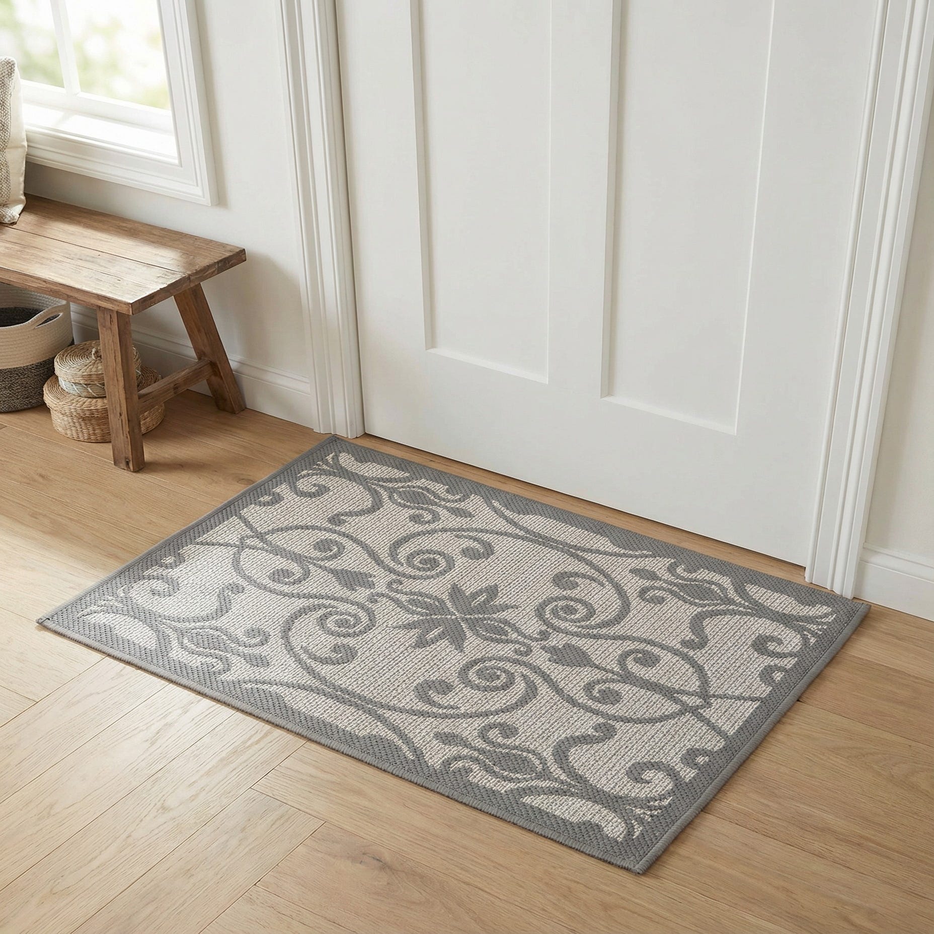 A refined scroll-and-floral motif unfolds across a gray background, the silver pattern forming symmetrical vines and a central floral medallion that give the rug a classic, slightly formal feel. Machine-made from 100% polypropylene, the piece has a low-profile, tightly woven texture with the pattern sitting subtly raised against the ground field — smooth to the touch but with enough relief to read visually. The gray background anchors the design while the silver accents add a cool, reflective quality that complements both light and darker furnishings.