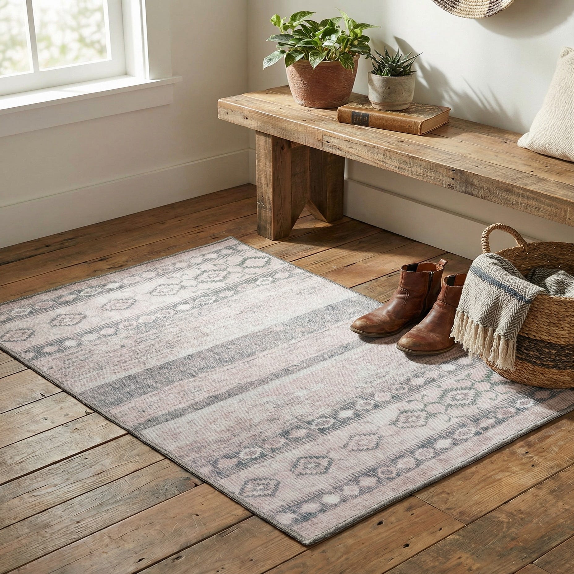 Given its color palette and design, this rug could serve as a subtle yet stylish enhancement to minimalist, Scandinavian, or transitional interiors. It's particularly well-suited for placements such as entryways, home offices, or as a base for a grouping of potted plants or accent furniture. The light colors can help to brighten up a space while the pattern adds a touch of visual interest without overwhelming the decor.