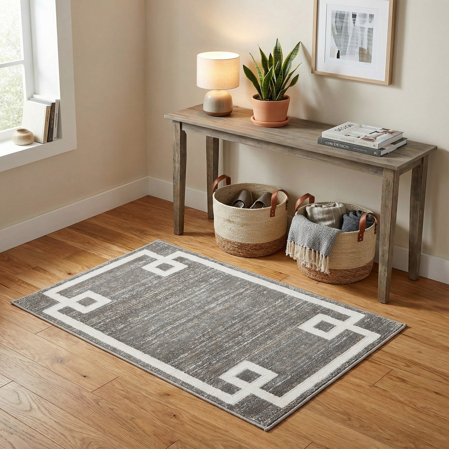 A 2x3 rectangular gray and silver contemporary rug with a textured pile, featuring a bold white Greek key border.
