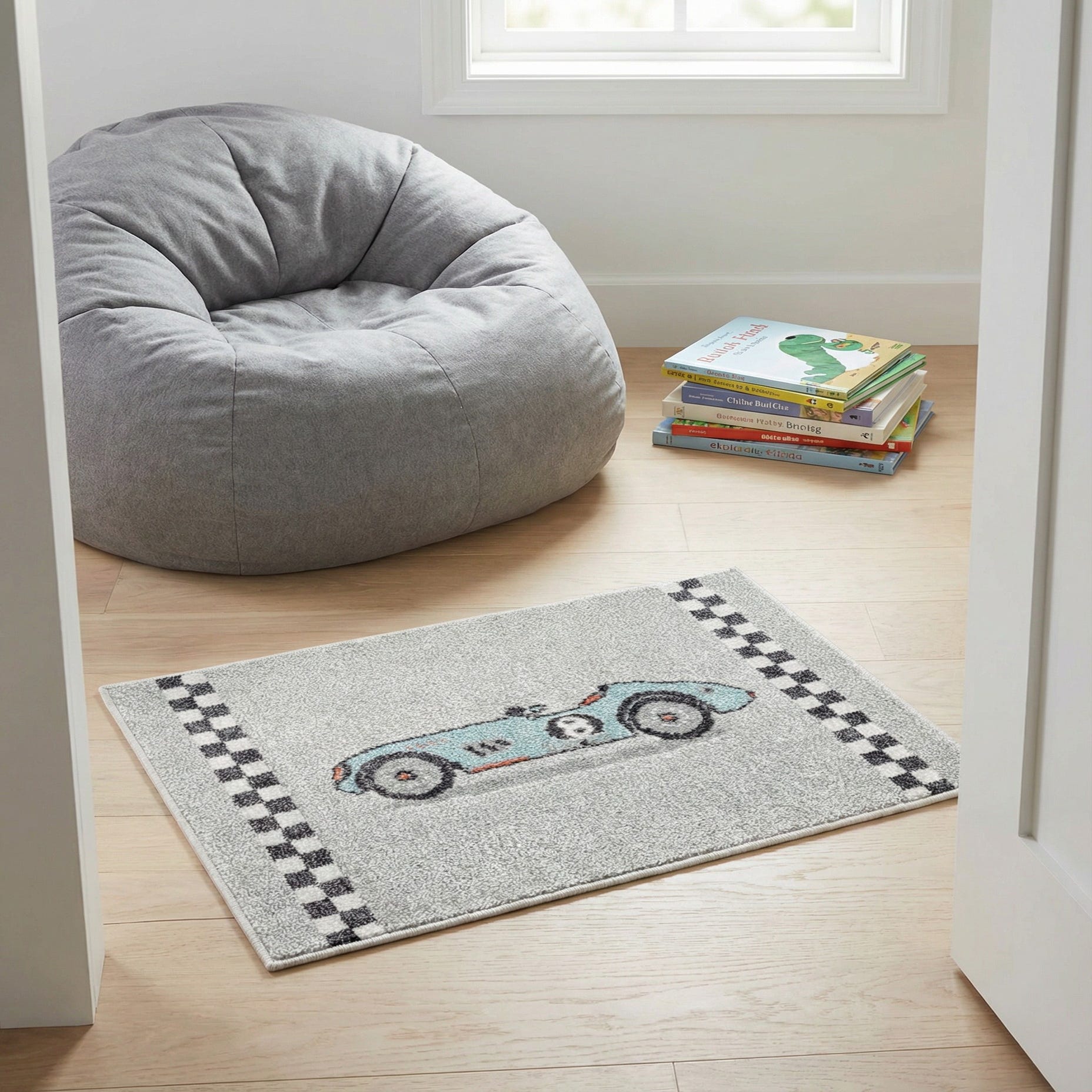 A playful vintage race car in light blue sits at the center of a soft gray field, outlined in black with ivory wheel details and small red highlights that add a pop of color. Black-and-ivory checker bands frame the top and bottom edges, giving the rug a fun, sporty look. Machine made of 100% polypropylene, the low, dense pile has a smooth, slightly springy hand that’s comfortable underfoot while retaining clear, well-defined patterning.