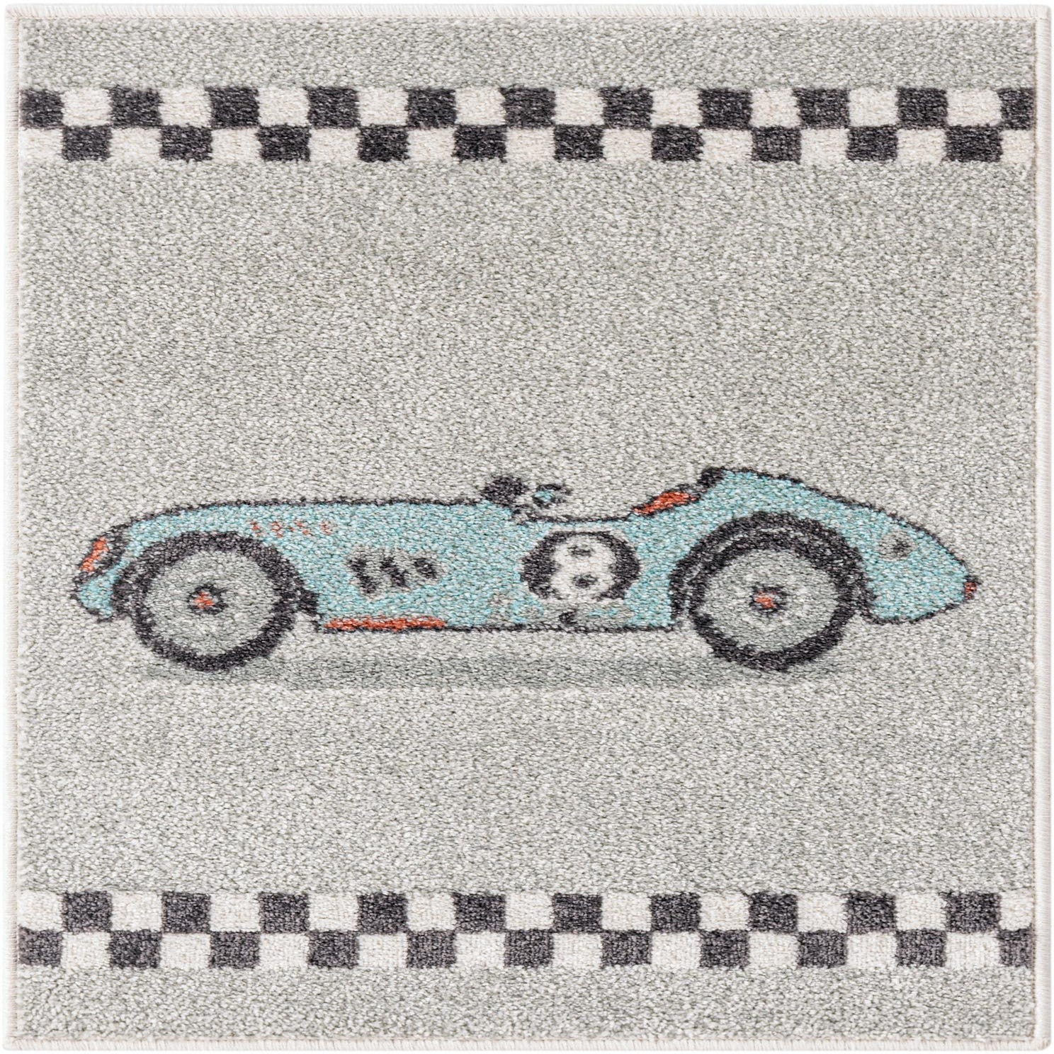 A playful vintage race car in light blue sits at the center of a soft gray field, outlined in black with ivory wheel details and small red highlights that add a pop of color. Black-and-ivory checker bands frame the top and bottom edges, giving the rug a fun, sporty look. Machine made of 100% polypropylene, the low, dense pile has a smooth, slightly springy hand that’s comfortable underfoot while retaining clear, well-defined patterning.