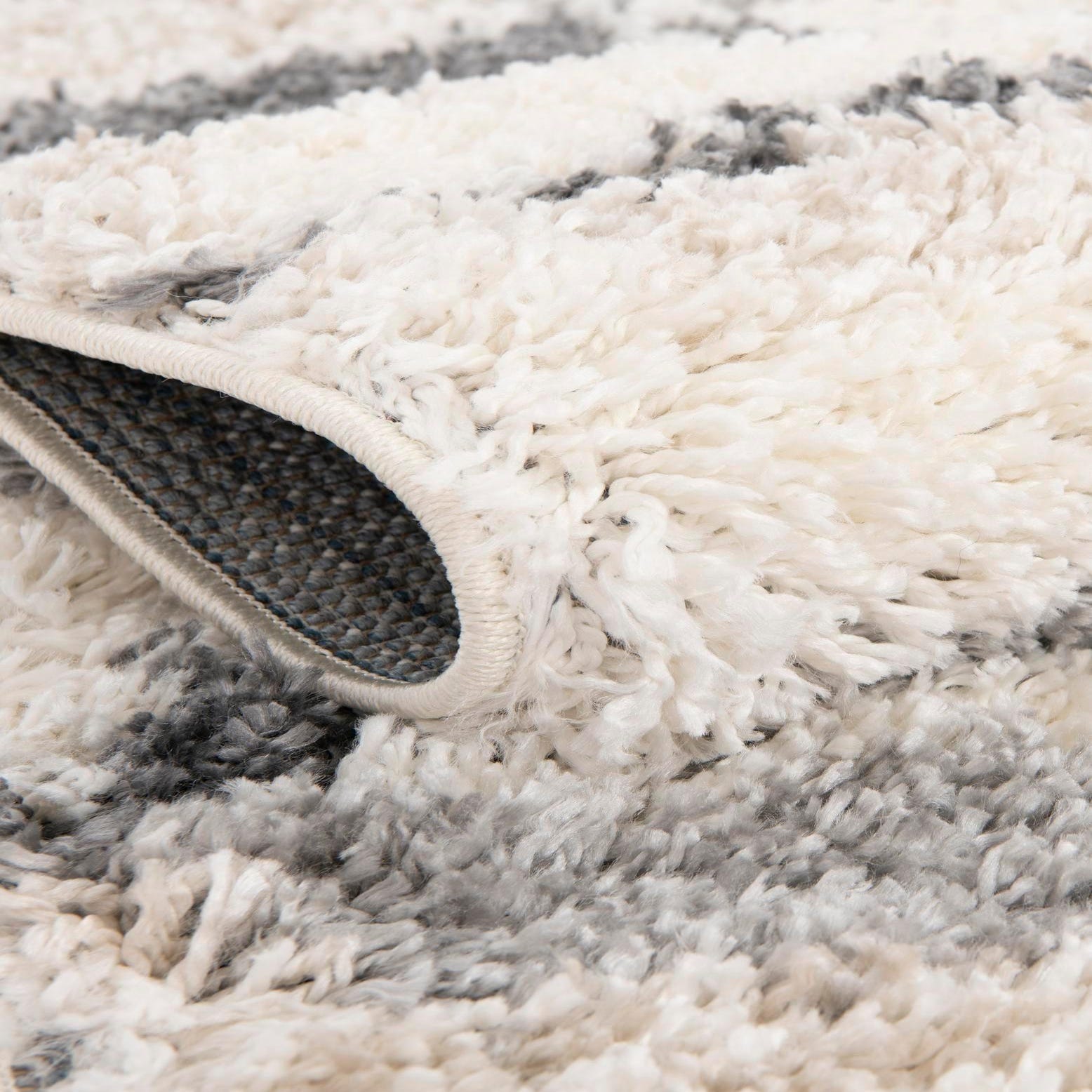 A soft, high-pile shag with a round silhouette, this rug pairs a gray background with ivory and beige geometric bands that intersect to form an offset diamond motif. The pattern has a relaxed, hand-tufted look created by contrasting pile heights and gently blurred edges between colors, giving the surface subtle depth and movement. Running your hand across the fibers reveals a plush, cushiony texture that invites bare feet and adds tactile warmth to a room.