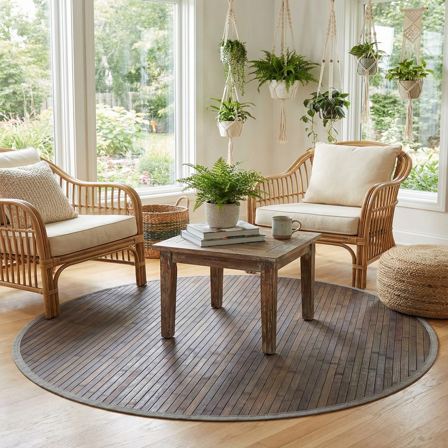 This round rug works well in entryways, beneath a small dining table, or layered under a reading chair to introduce organic texture without overpowering a room. It pairs easily with mid-century wood pieces, leather accents, neutral upholstery, or a minimalist palette, and will suit contemporary, transitional, coastal, and Scandinavian interiors that favor understated, natural materials.