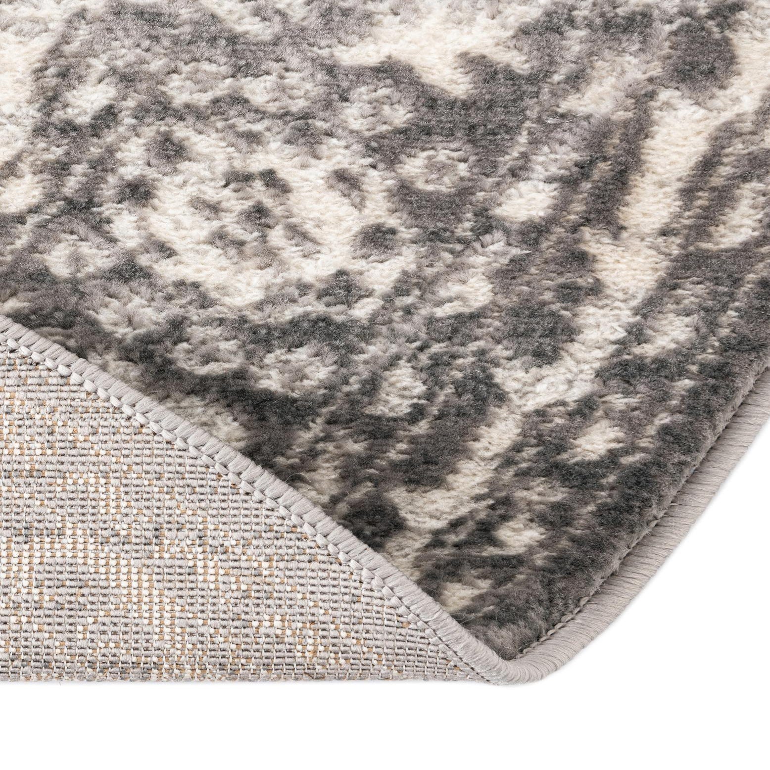 The round silhouette makes this rug well suited to anchor a small seating area, a bedside vignette, or a cozy entryway. It also layers nicely under a round dining table or in a breakfast nook, complementing transitional, modern farmhouse, or contemporary-traditional interiors where soft gray and ivory palettes are desired.