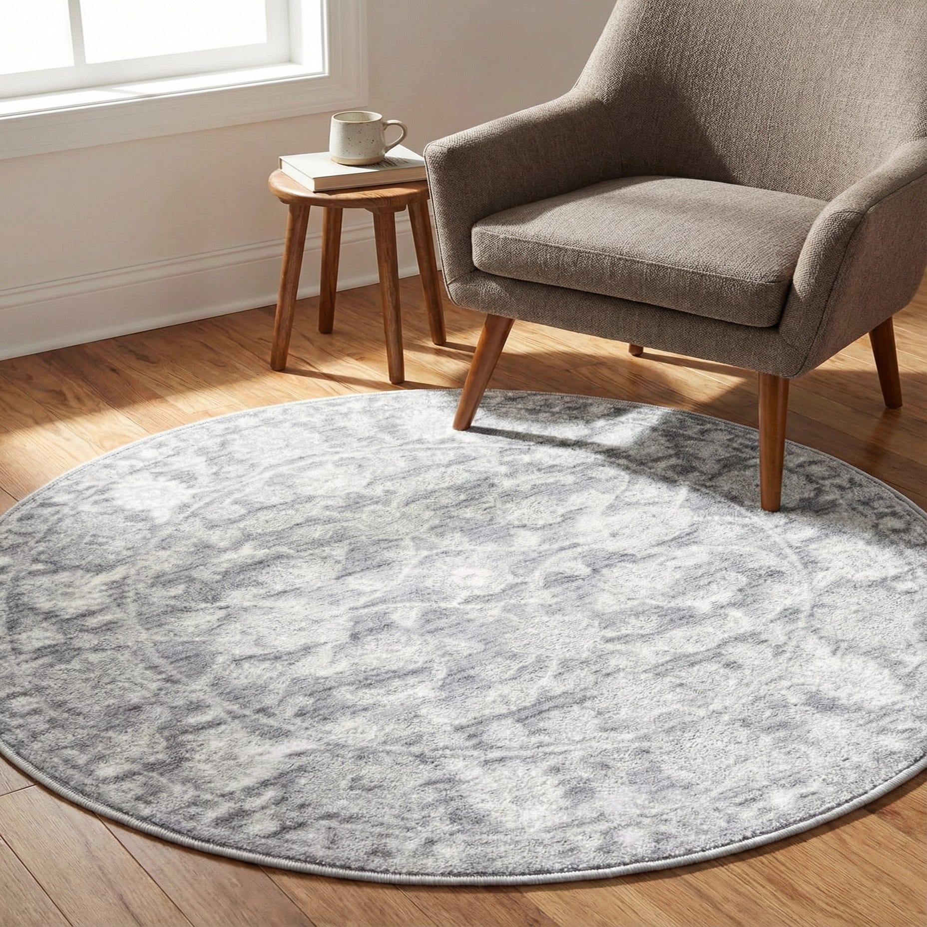 Ideal for small-scale placements, the round shape works well in entryways, powder rooms, a cozy reading nook, or layered beneath a small round side table. Its neutral gray and ivory palette pairs easily with modern, coastal, or soft-industrial interiors, and it can soften monochrome schemes or balance wood and metal finishes without dominating the room.