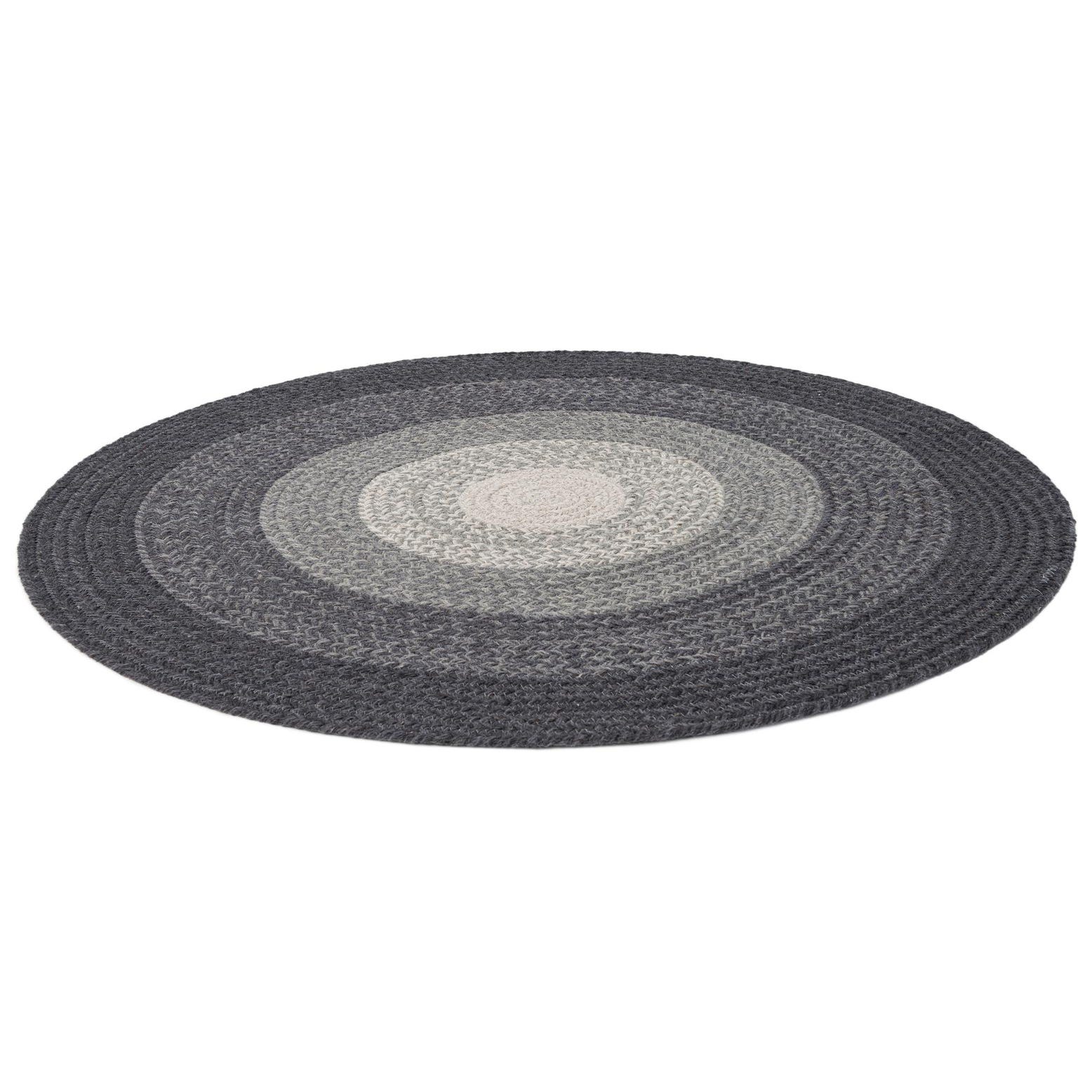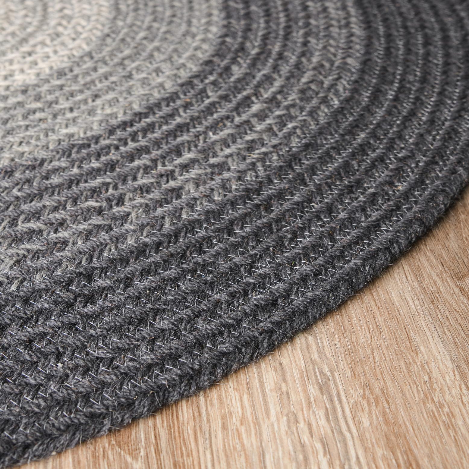 Round hand-braided wool rug with a gradient pattern, transitioning from light gray in the center to dark gray at the edges.
