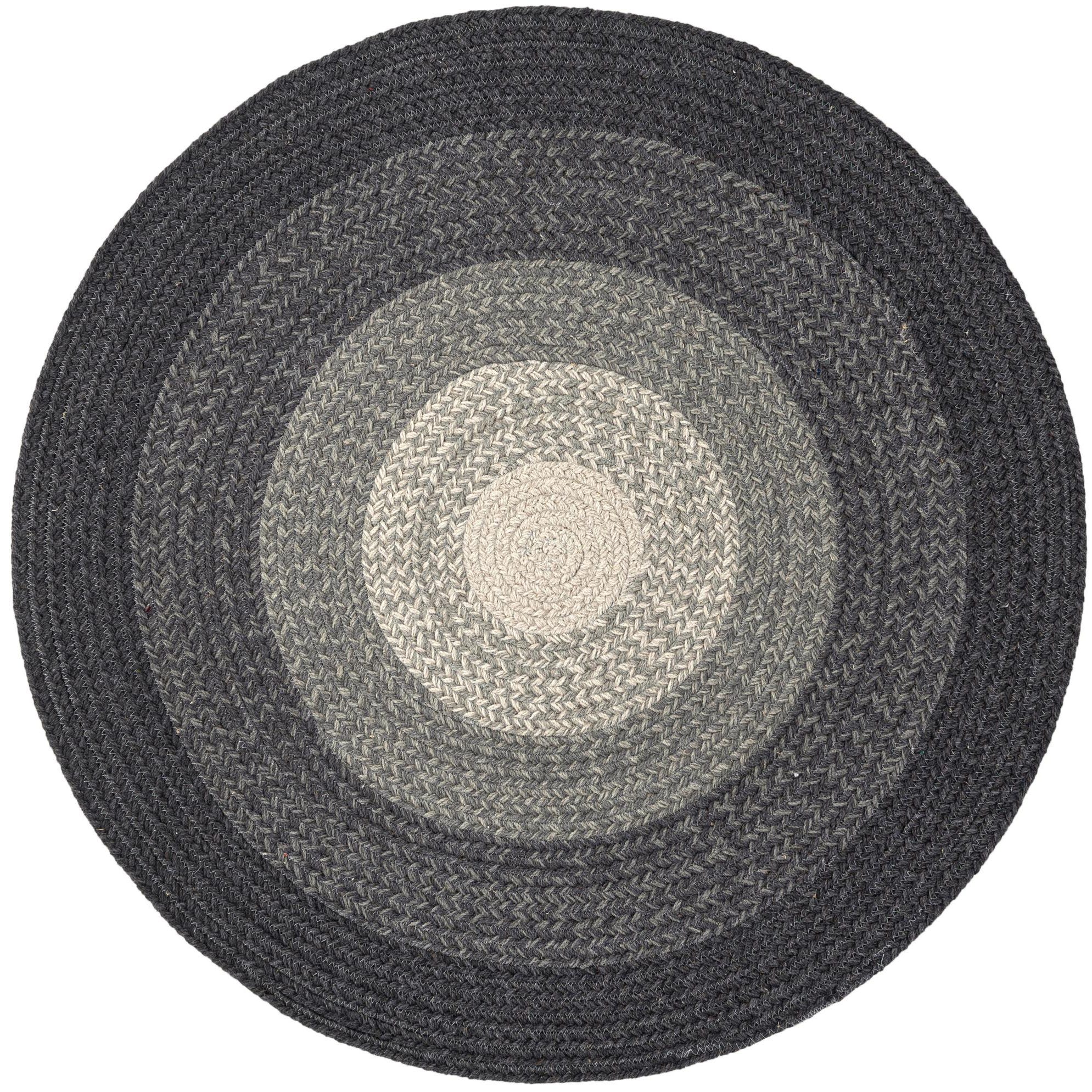 Round hand-braided wool rug with a gradient pattern, transitioning from light gray in the center to dark gray at the edges.
