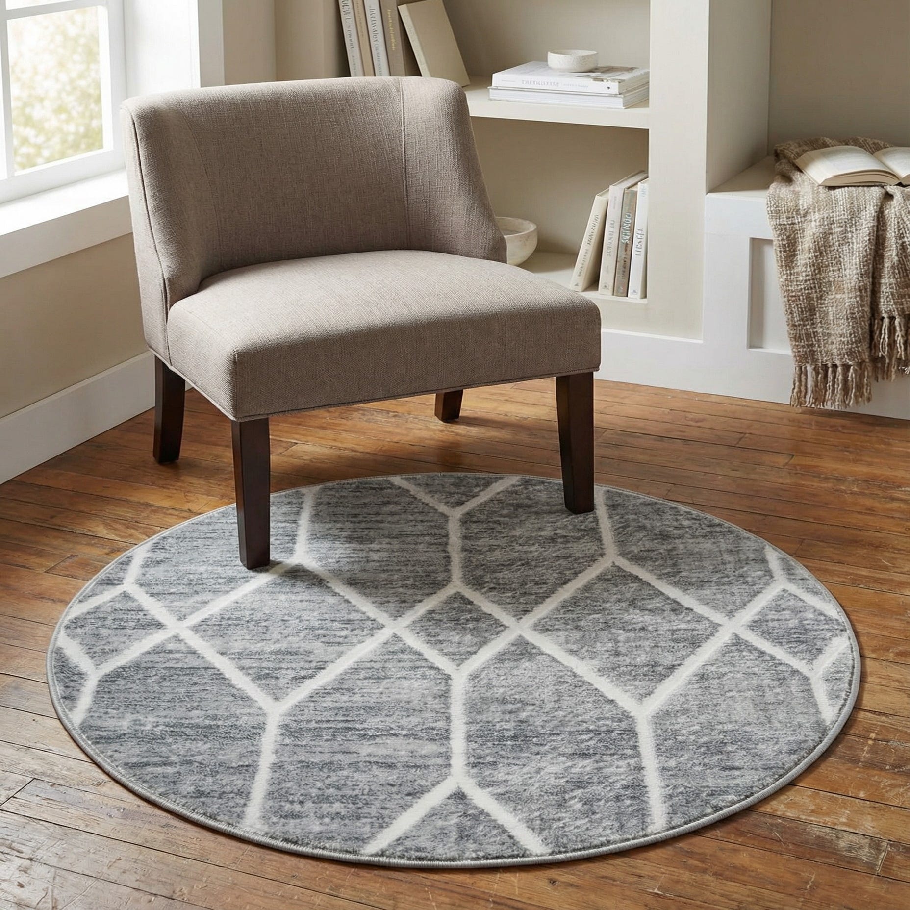 A 3' 3 x 3' 3 round gray rug featuring a modern white trellis pattern, suitable for various indoor spaces.